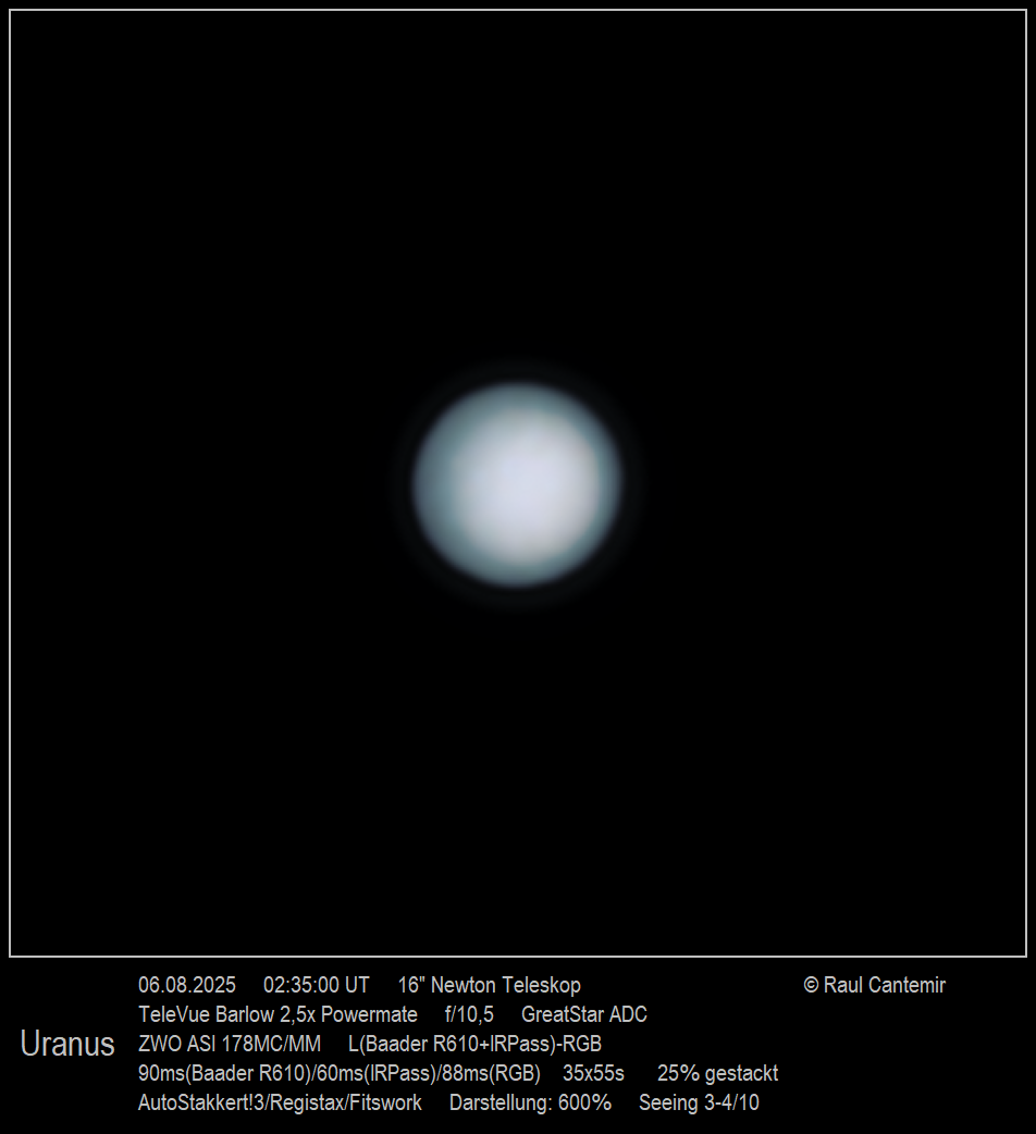 Trotz des mäßigen Seeings sind die charakteristische Färbung des Uranus und leichte Helligkeitsunterschiede in der Atmosphäre klar erkennbar – ein zufriedenstellendes Ergebnis unter schwierigen Bedingungen.