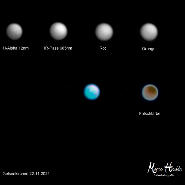 Aus dem Ruhrgebiet heraus bei recht gutem Seeing konnte ich am 22. November 2021 um etwa 22:40 Uhr recht gute Ergebnisse mit fünf verschiedenen Filtern erzielen. Während sich seit Jahren die Fotografie im Rot und IR-Pass-Kanal durchgesetzt hat bei Uranus, so habe ich neben diesen noch einige Andere ausprobiert. Für mich allerdings sieht das Ergebnis mit dem Orange-Filter sehr vielversprechend aus, der eigentlich eher beim visuellen Einsatz an Teleskopen genutzt wird.