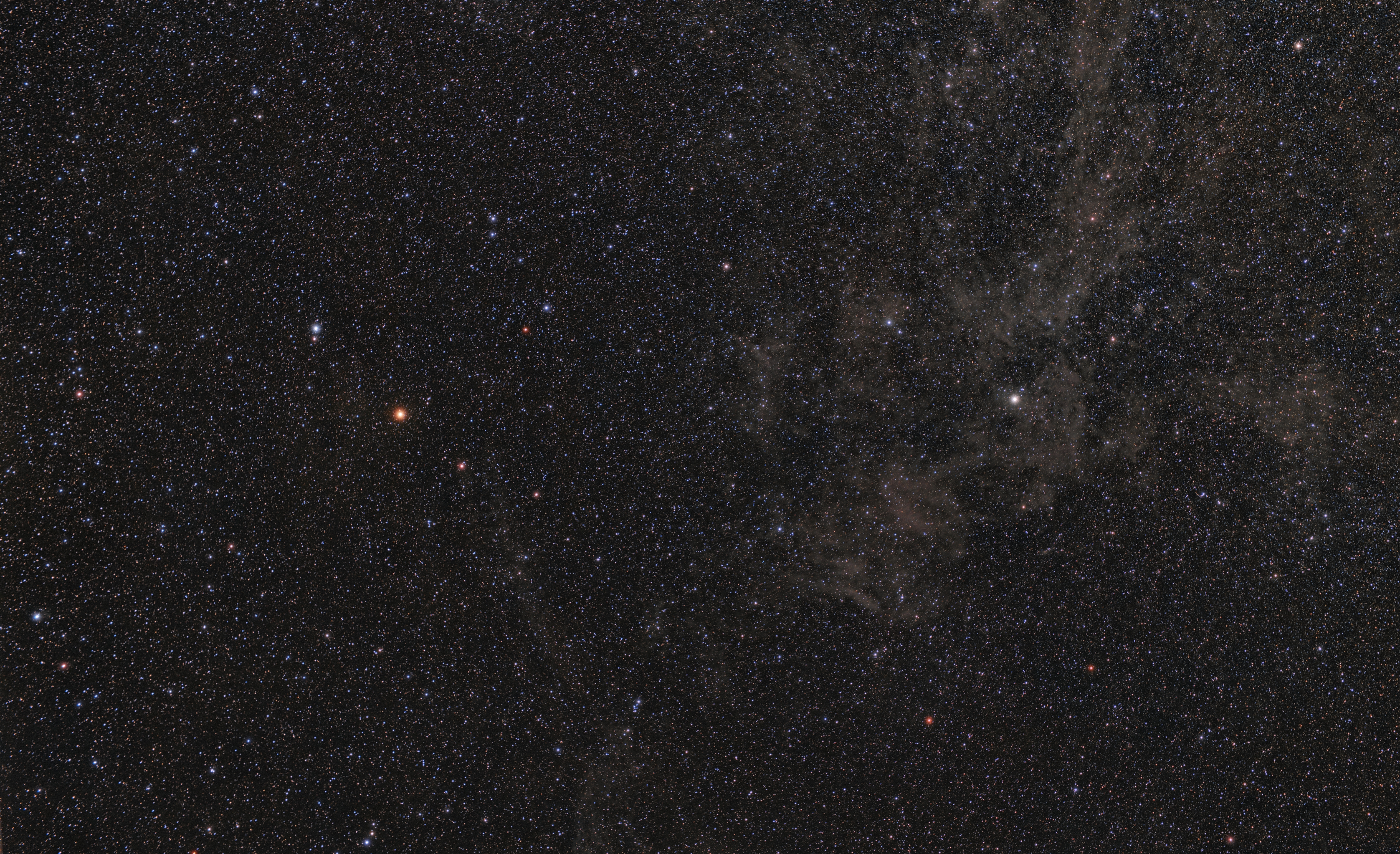 Ein großer Molekülwolken-Komplex zieht sich durch den Großen und Kleinen Bären und dabei direkt am Polarstern vorbei. Diese schwachen Wolken wurden in dieser Bearbeitung selektiv verstärkt, und so entsteht dieses ganz unvertraute Bild unserer Polarregion. Kochab links, Polaris rechts.