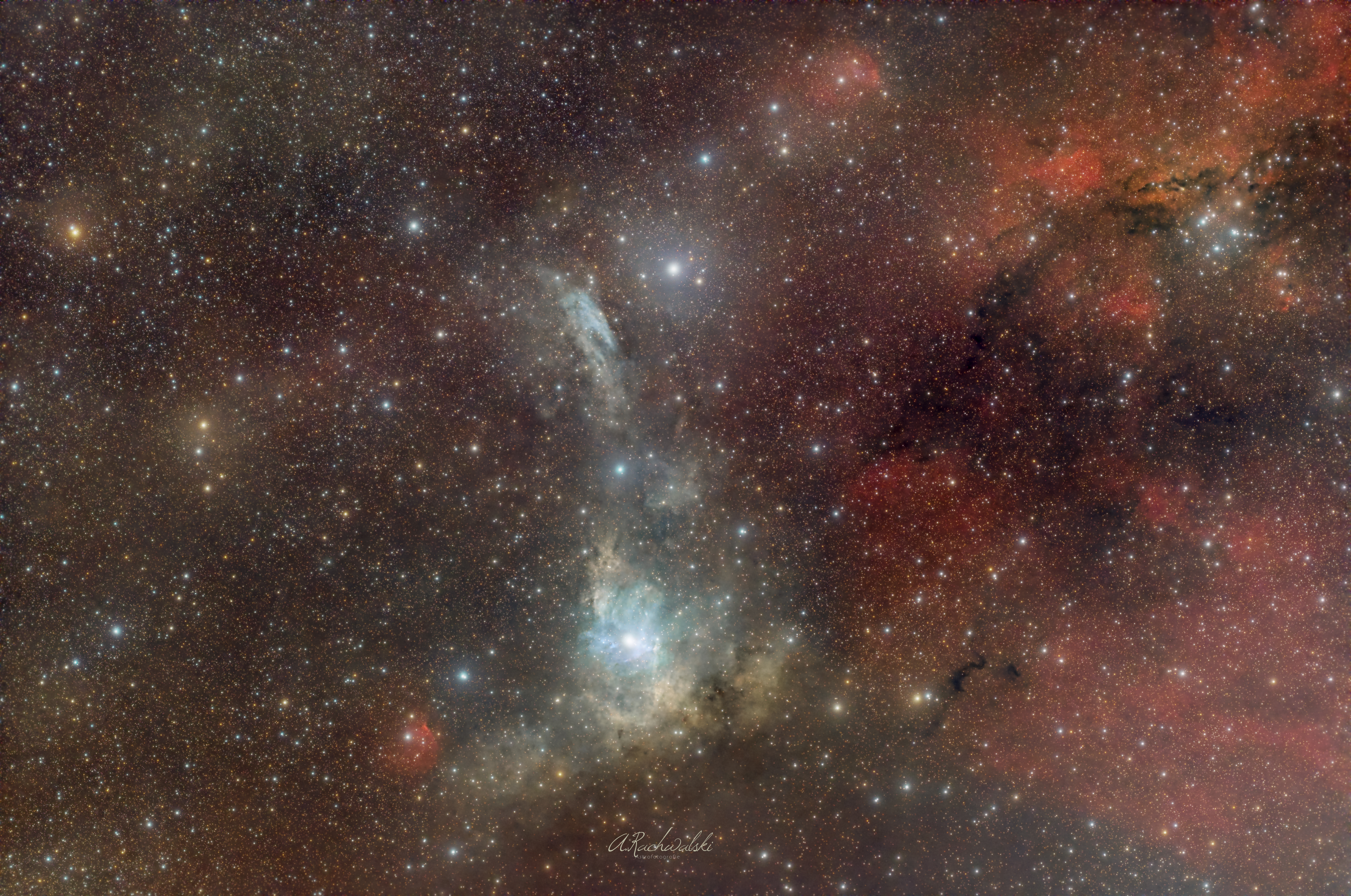VdB 14 und VdB 15 sind ein Paar von Reflexionsnebeln, die einen kleinen Teil der viel größeren Staubwolke im Sternbild Giraffe darstellen. VdB 15 ist der große Nebel auf der linken Seite, um den zentralen Stern C Cam (5 mag), während VdB 14 der etwas kleinere elliptisch geformte Nebel auf der rechten Seite ist, direkt neben dem Stern B Cam (4 mag).