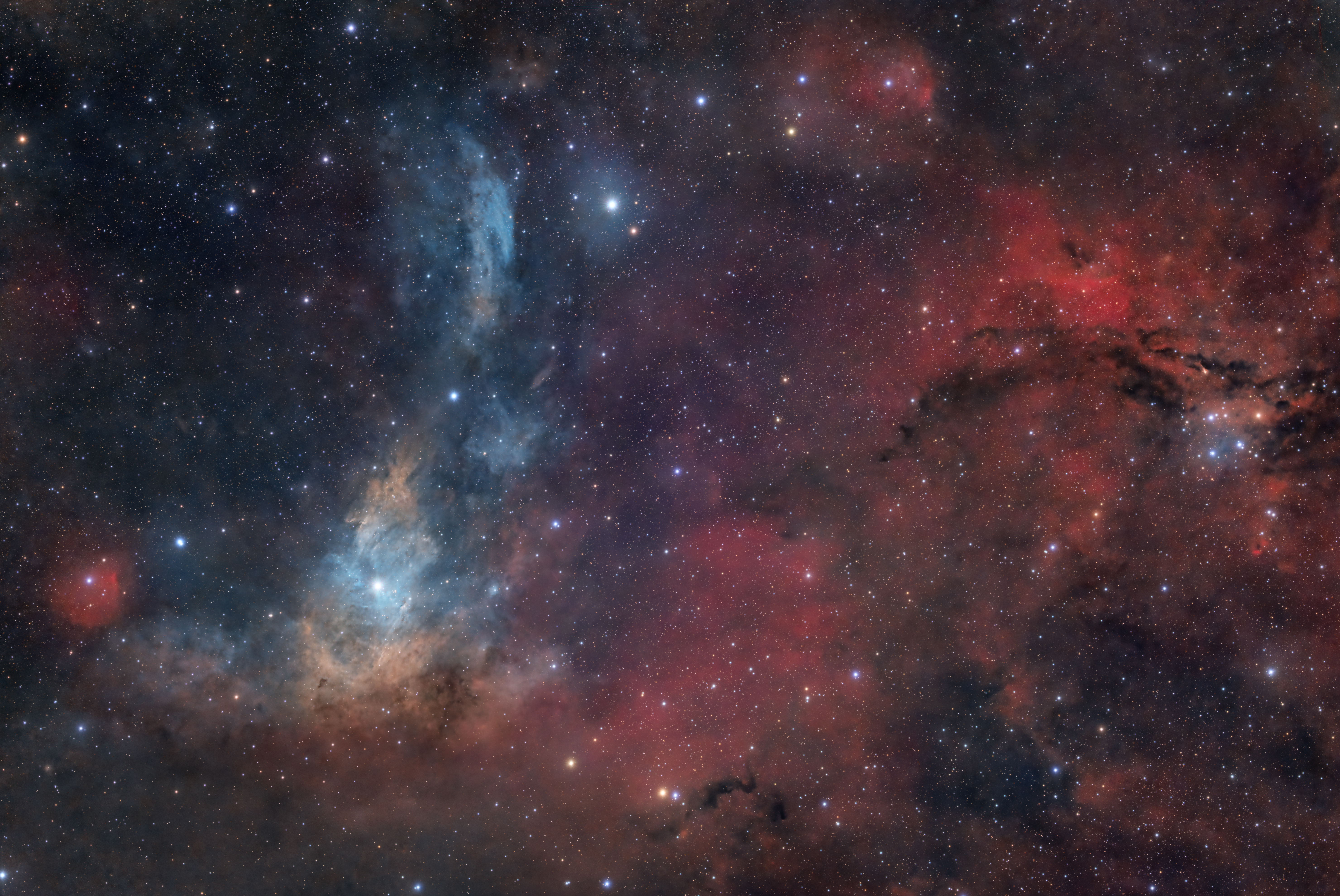 VdB 14 & 15 (links im Bild) sind zwei sehr schöne Reflexionsnebel, die zusätzlich aber auch ein paar Emissionsanteile enthalten. Dank meiner 400 mm Brennweite konnte ich die beiden mit dem großen Nebelgebiet Sh2-202 und dem darin eingebetteten offenen Sternhaufen Stock 23 (rechts) kombinieren, an dem noch einige Dunkelwolken (LDN 1377 bis 1384) vorbeilaufen. Das alles liegt in unmittelbarer Nachbarschaft zum populären Herz- und Seelennebel, weshalb diese Ecke des Himmels auch wieder relativ selten fotografiert wird. Alles in diesem Bereich ist zudem sehr lichtschwach (mit Ausnahme des Sternenhaufens), so dass ich über 13 Stunden bei f/2 damit verbracht habe, genügend Daten für eine ansprechende Bearbeitung zur Verfügung zu haben. Davon sind elf Stunden auf RGB und zwei Stunden auf H-Alpha entfallen, um die Nebelbereiche etwas deutlicher hervorzubringen.