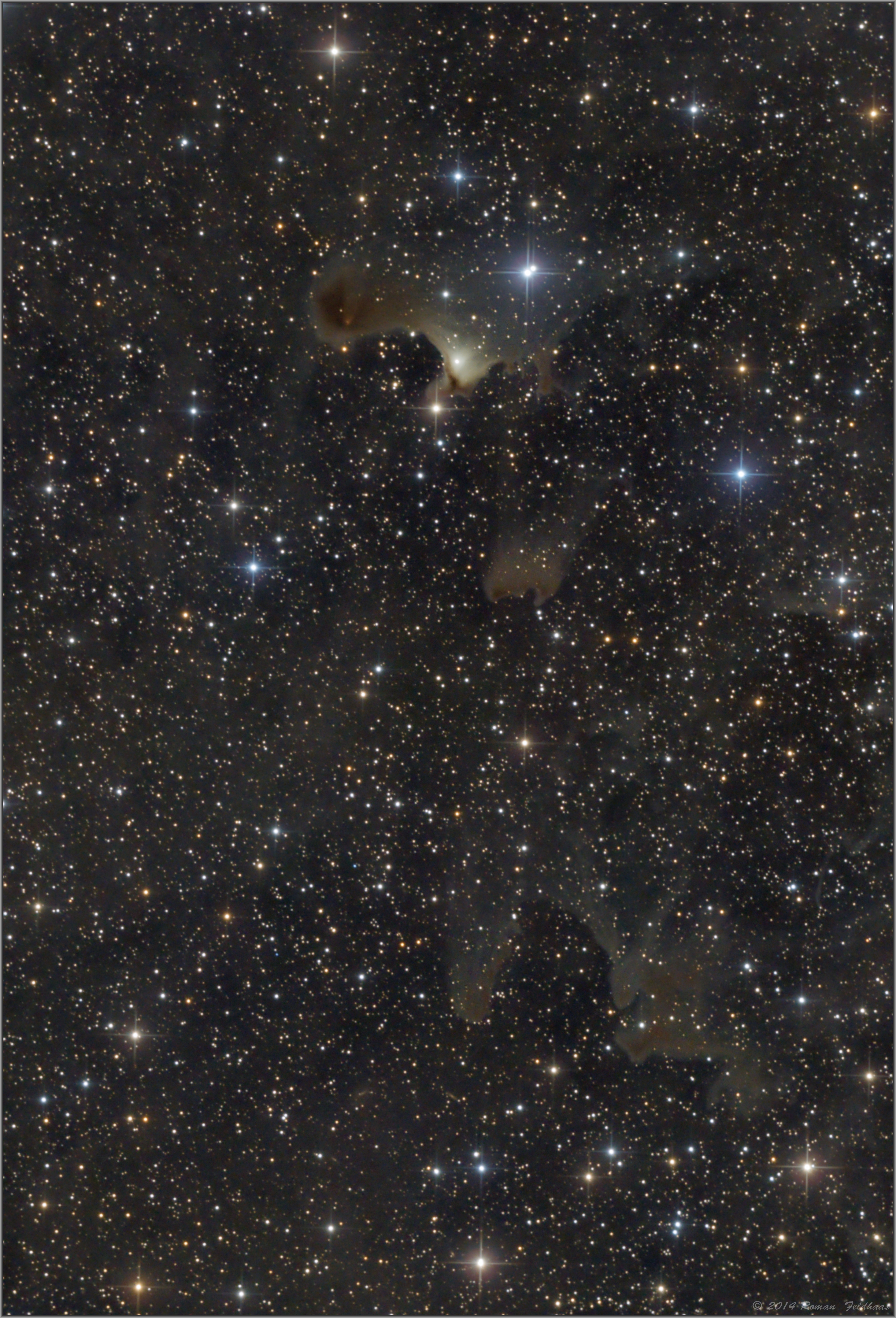 Im Zentrum befinden sich mehrere Infrarot-Quellen sowie teilweise junge Sterne, deren Emissionen den Nebel zu bräunlichem Leuchten anregen.