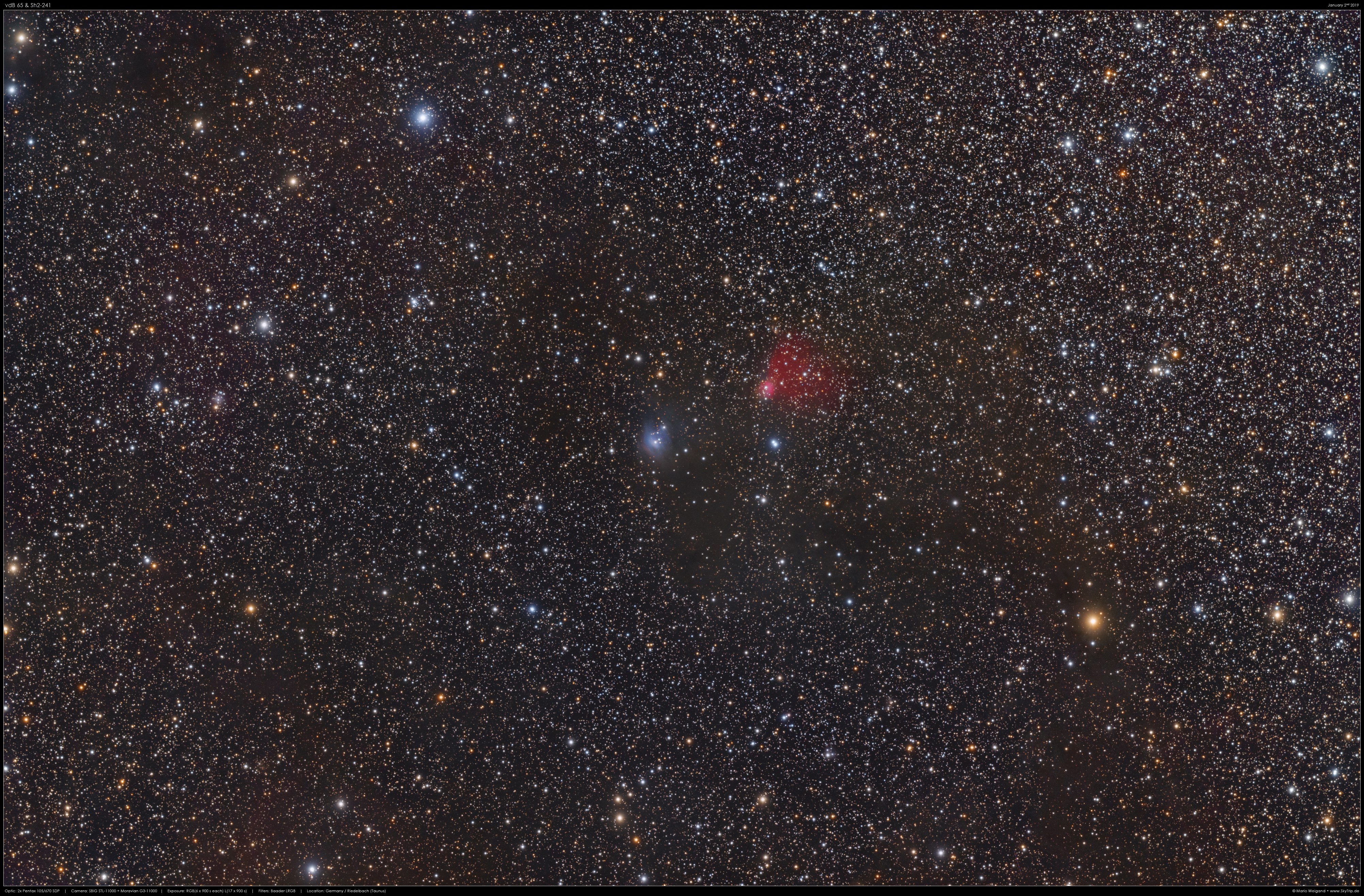 Im Südosten des Sternbilds Fuhrmann, fast schon in den Zwillingen, liegt der selten beachtete Reflexionsnebel vdB 65 zusammen mit dem Emissionsnebel Sh2-241. Wie hier auf der Aufnahme gut zu sehen ist, liegen die beiden Nebel bei einem Strang aus Dunkelwolken (LDN 1550/5/7), die quer durch das Bildfeld laufen. Ein Stern mit rund 10,6 mag beleuchtet einen Teil des Molekülwolkenkomplexes und erzeugt so den rund zwei Bogenminuten großen, blauen Reflexionsnebel. Seine Entfernung wird auf 3600 Lichtjahre geschätzt. Der Emissionsnebel Sh2-241 ist ein deutliches Zeichen von Sternentstehung, steht jedoch nicht im Zusammenhang mit den sichtbaren Dunkelwolken. Er ist mit 15300 Lichtjahren viel weiter von uns weg. UV-Licht eines heißen O9V-Sterns im Inneren des Nebels ionisiert dessen Wasserstoff-Atome und verursacht so das rote Leuchten in der H-Alpha-Linie.