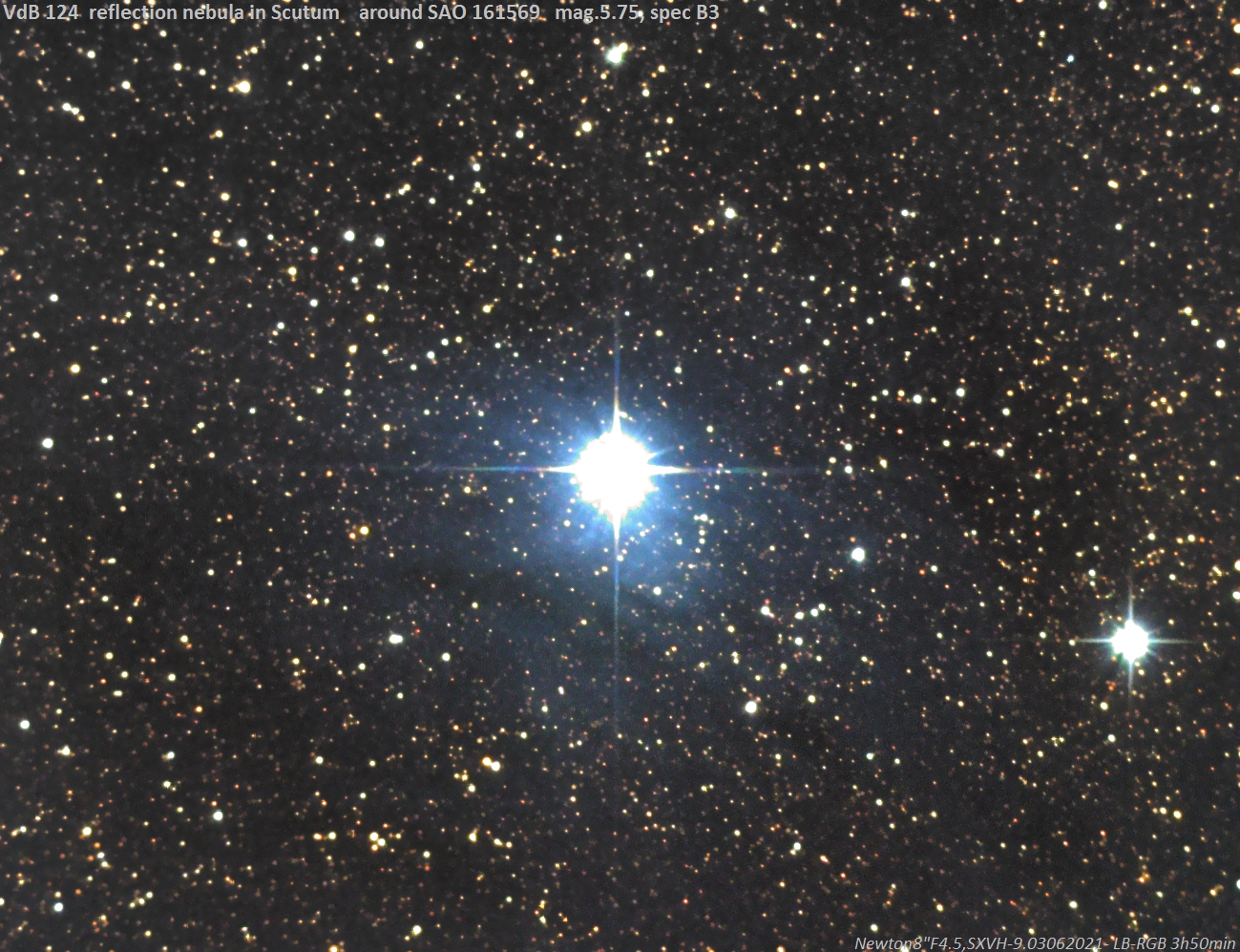 Vom ultravioletten Licht des Sterns SAO161569 (Spektraltyp B3, 5,75 mag) wird der umgebende Nebel Van den Bergh 124 zum blauen Leuchten angeregt.