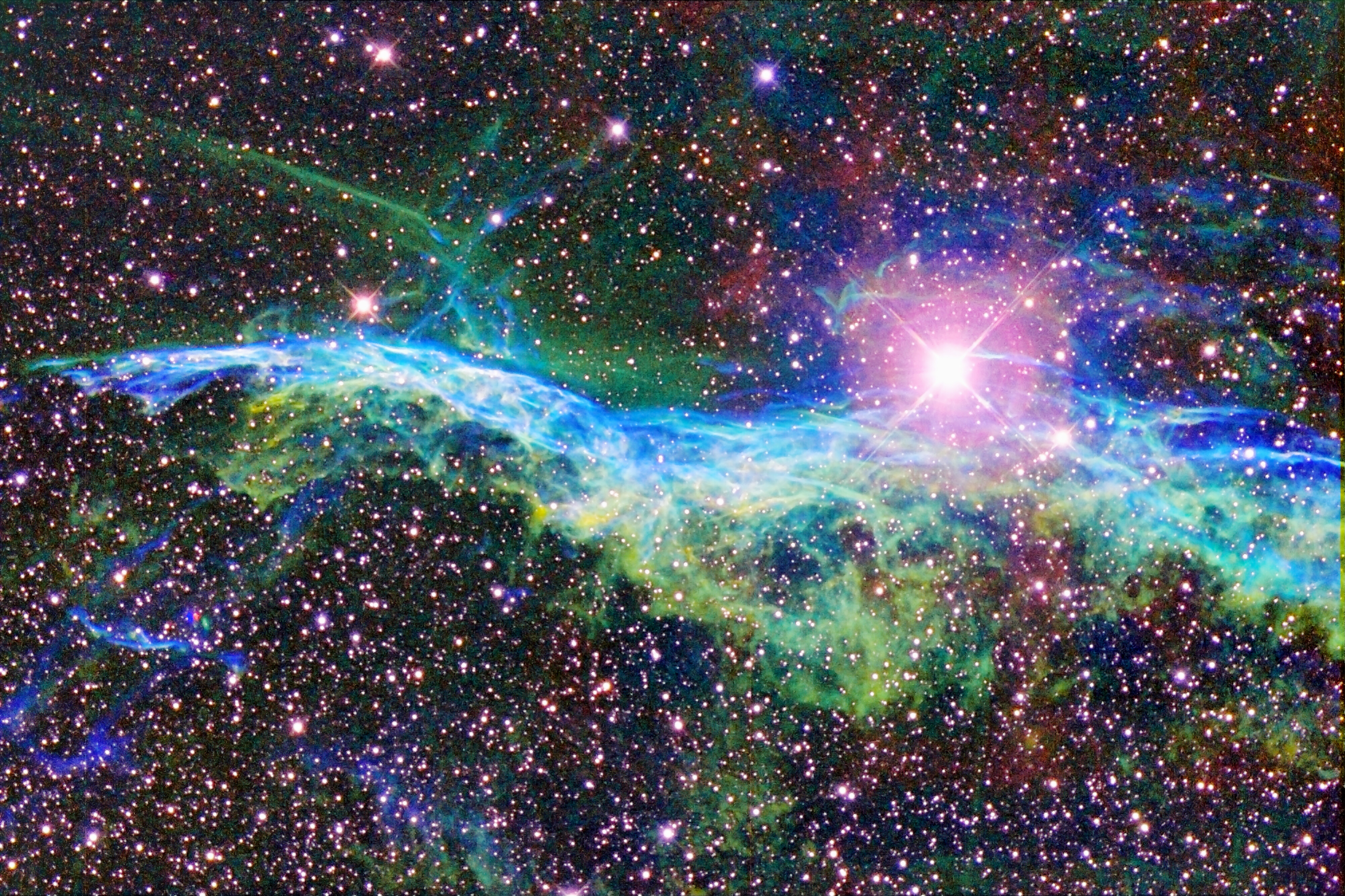 Veil Nebula im Sternbild Schwan, Supernova-Überrest mit Schmalbandfilter (SII-H-Alpha-OIII-Filter ) aufgenommenen. Je 20 Minuten Einzelbild pro Filter und sechs Stunden pro Kanal. Also 18 Stunden Belichtungszeit.