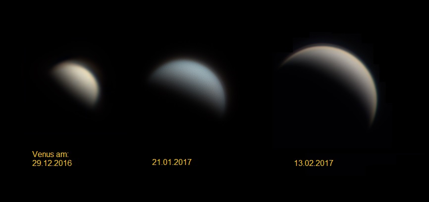 Die Venus nimmt mit zunehmender Annäherung an die Erde kontinuierlich an beleuchteter Fläche ab und nähert sich der Sichelgestalt. Gleichzeitig gewinnt sie dramatisch an Größe. Drei Bilder konnte ich inzwischen nebeneinander stellen und hoffe noch auf ein Letztes mit ganz schmaler Sichel, bevor der "Abendstern" wieder zum "Morgenstern" wird.