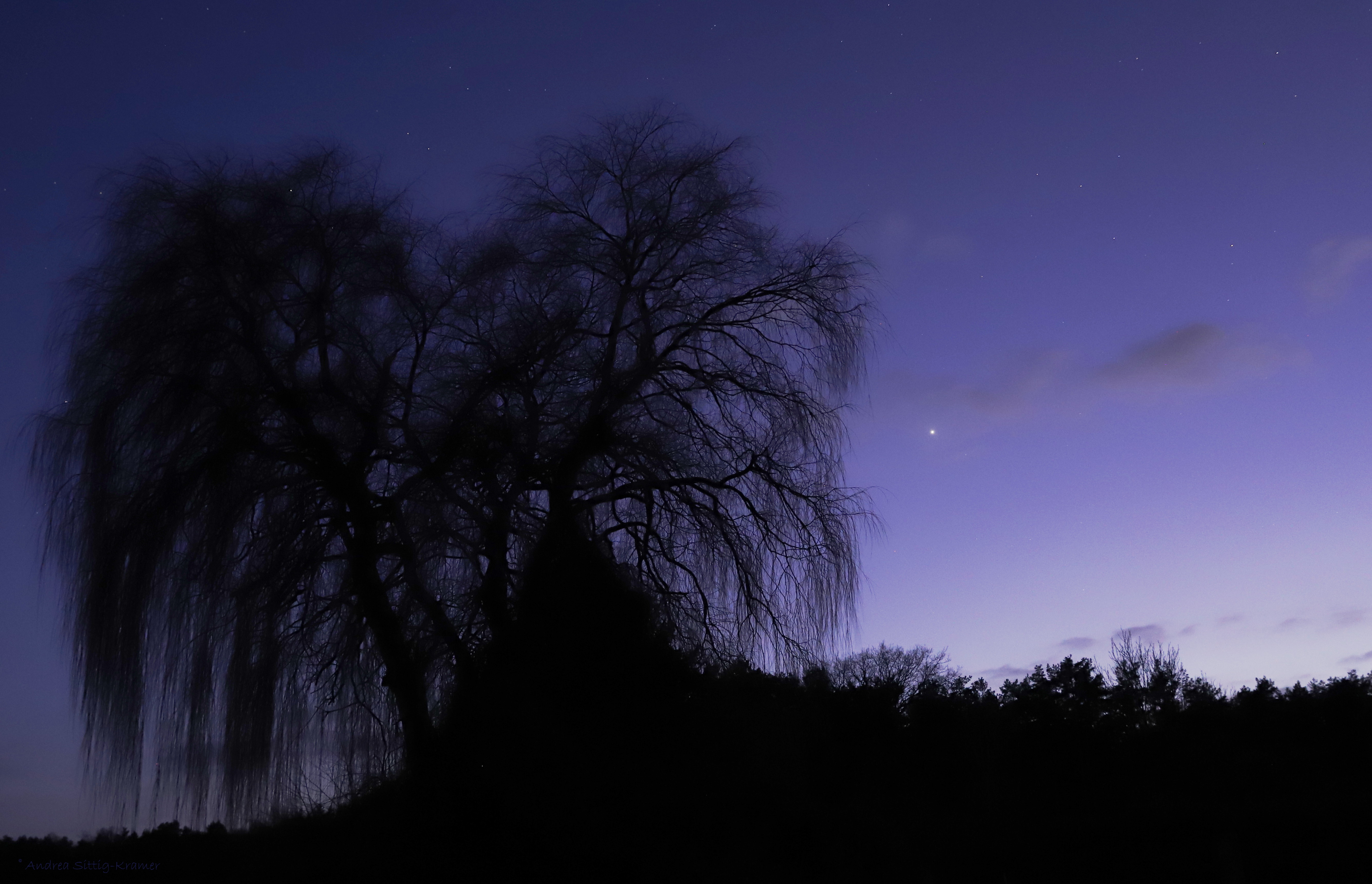 Derzeit dominiert die Venus den abendlichen Himmel. Am 19. Januar 2020 war unser Nachbarplanet kurz nach Sonnenuntergang am sternenklaren Firmament über Uelzen gut beobachten. Der Abendstern leuchtete mit ca. –4 mag visueller Helligkeit im Sternbild Wassermann. Auf meinem Bild strahlt sie scheinbar rechts neben einer prächtigen Trauerweide.