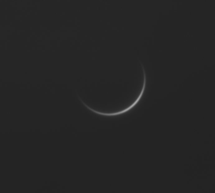 Zwei Tage vor der unteren Konjunktion gelang dieser Schnappschuss - die Venus war nur 9,5 Grad von der Sonne entfernt. Um den blauen Taghimmel abzudunkeln, wurde ein IR742-Nahinfrarotfilter vor die QHY533M-Kamera geschraubt. Zur Brennweitenverlängerung auf 2.012mm wurde eine TeleVue 2.5x PowerMate verwendet.