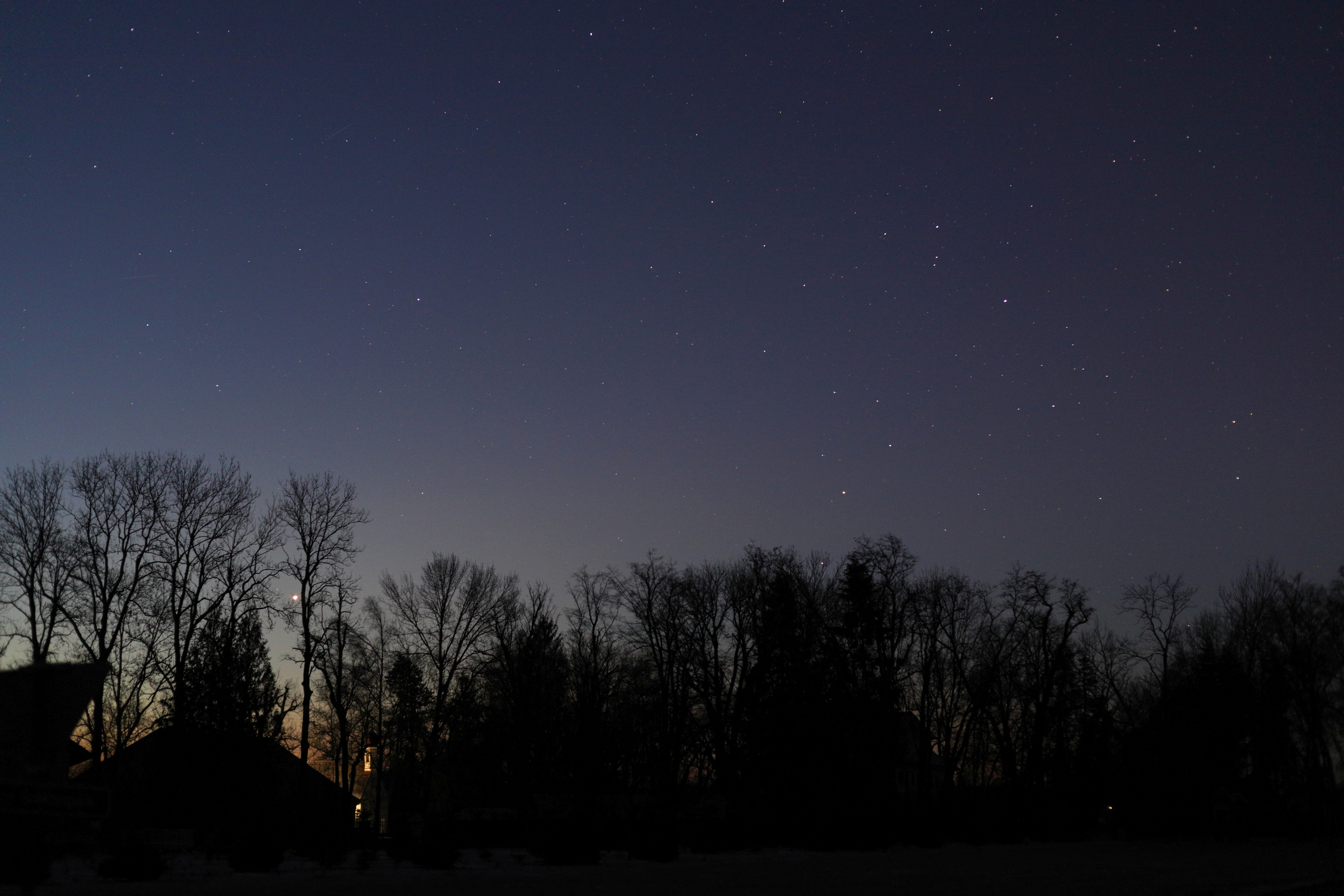 Venus ist nun am Morgenhimmel immer tiefer zu sehen, ihre schöne Sichtbarkeit endet im März. An den eiskalten Morgen des 20. und 21. Januar 2024 sah ich sie tief im Sternbild Schütze, rechts ist der Kopf des Skorpion zu erkennen. Venus links unten bei den Bäumen, rechts der Kopf des Skorpion mit Antares.