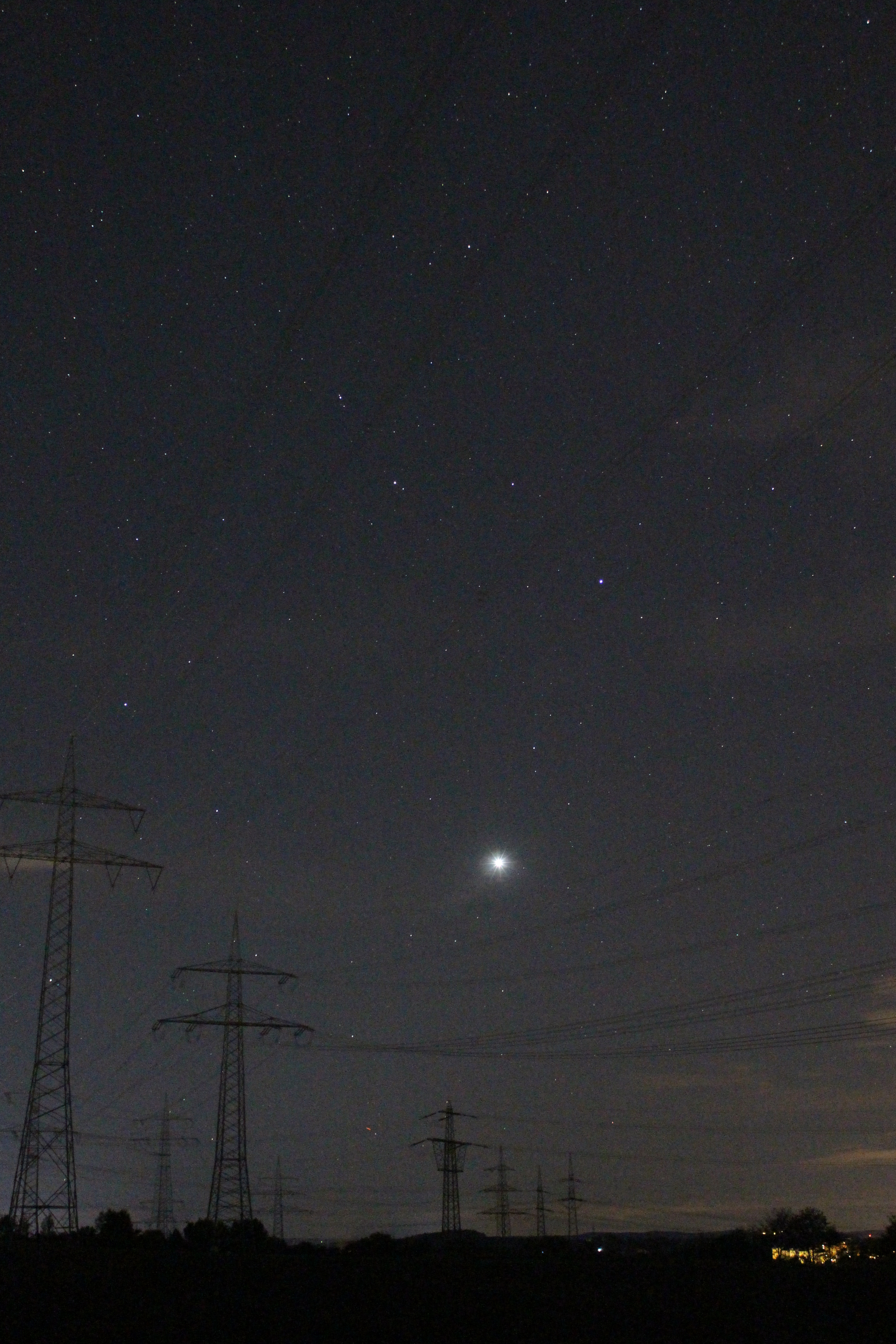 Venus am Morgenhimmel mit den Hochspannungsleitungen, die nördlich des Umspannwerks Hoheneck verlaufen, im Vordergrund.