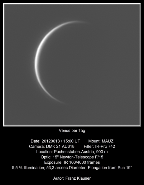 Venusaufnahmen am Tag erfordern beim Stand nahe der Sonne Maßnahmen zur Verhinderung von Streulicht, vor allem bei meinem 15-Zoll-Newton mit offenen Gitterrohrtubus.