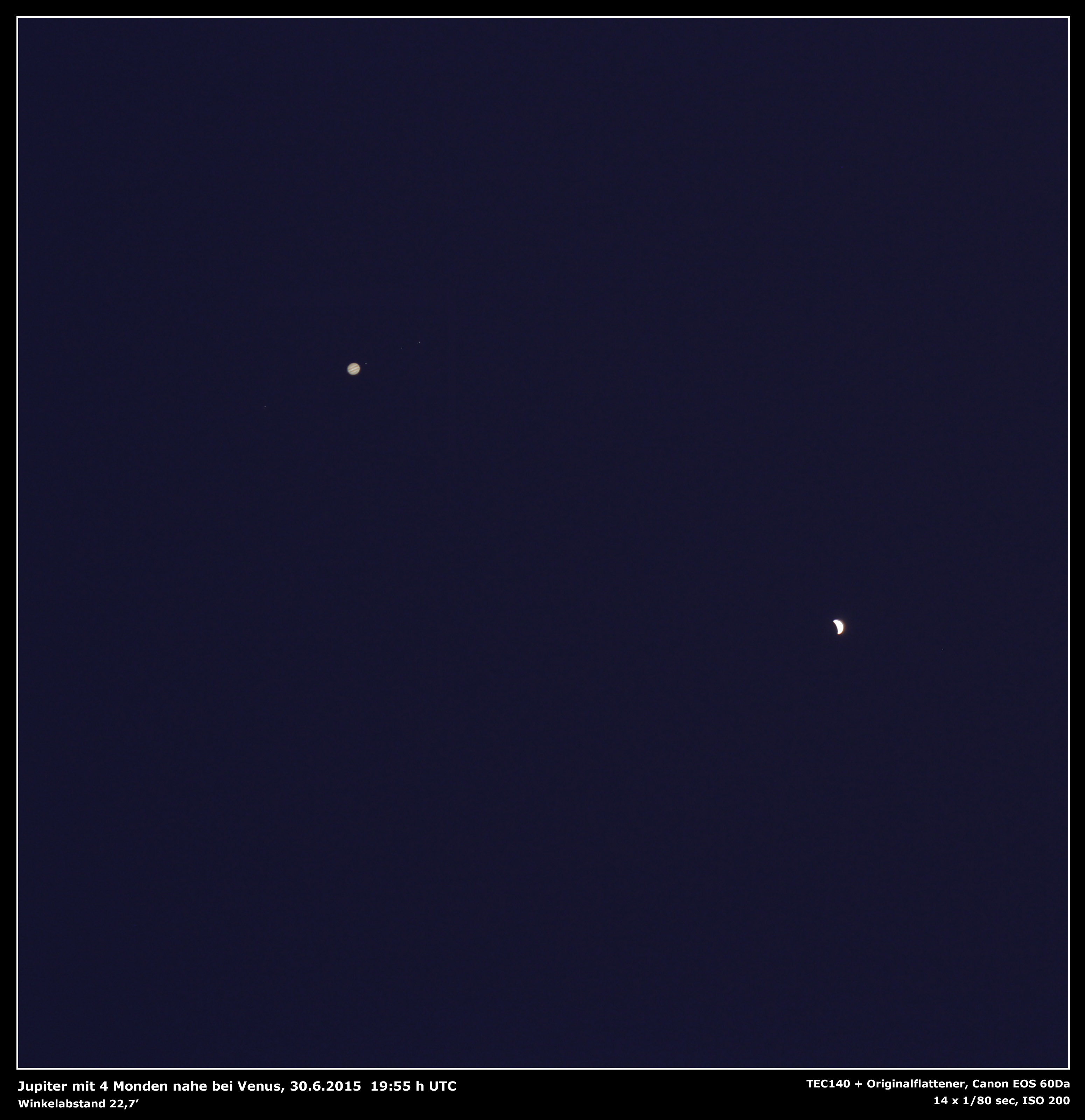 Zur Zeit der Aufnahme betrug der gegenseitige Abstand der beiden Planeten rund 22,7 Bogenminuten. Vier Monde und einige Bänder auf der Jupiteroberfläche sind beim Hineinzoomen ins Bild sichtbar. Trotz der noch heißen Temperaturen an diesem Abend und der bereits tiefen Stellung am Himmel war das Seeing erstaunlich gut.