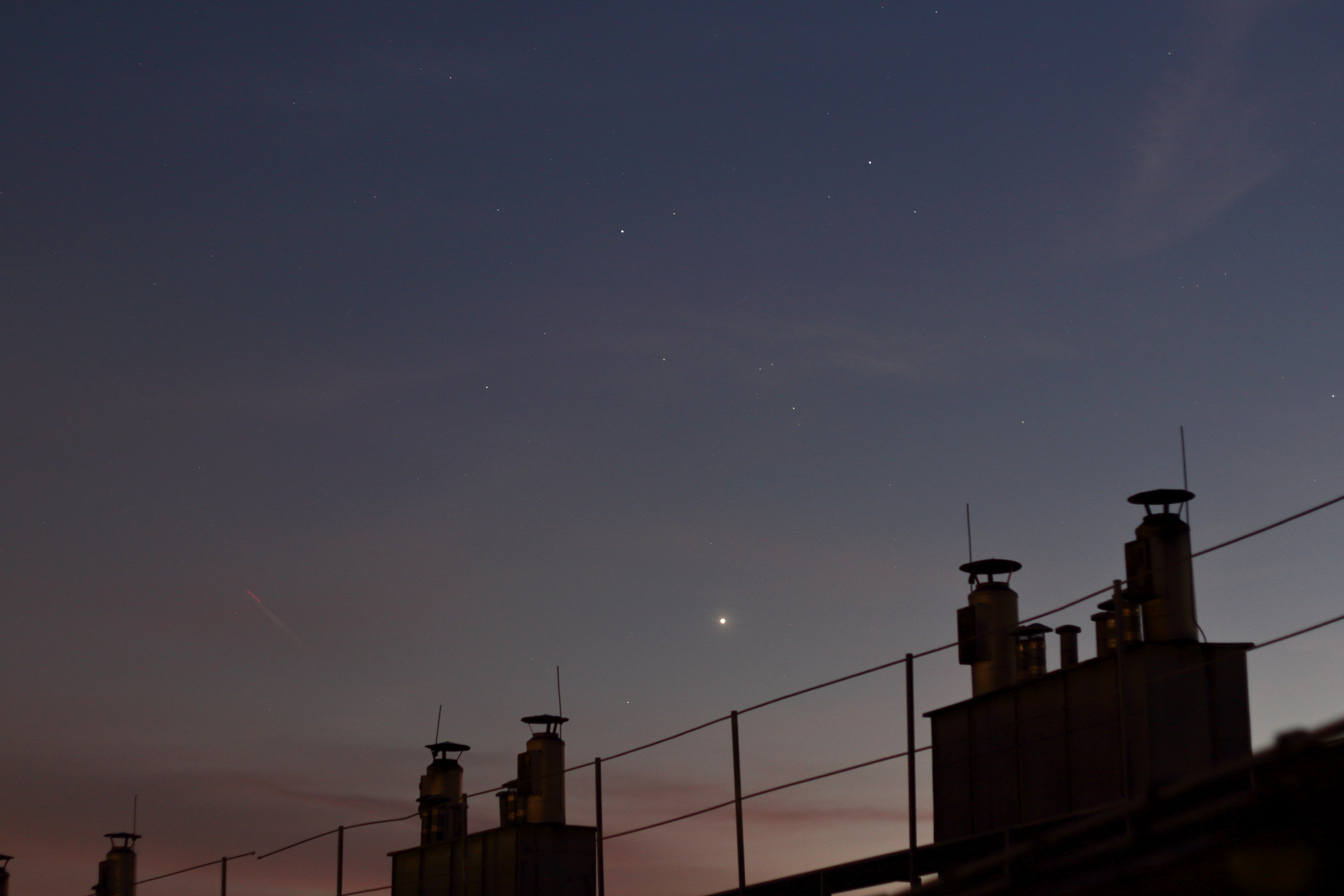 An den letzten Abenden ist der Himmel oft mit zarten Wolkenschleiern überzogen. Zusammen mit der langdauernden Dämmerung und dem Abendrot zeigt sich Venus als Abendstern besonders schön. In den nächsten Tagen zieht sie südlich an den Zwillingssternen Kastor und Pollux vorbei.