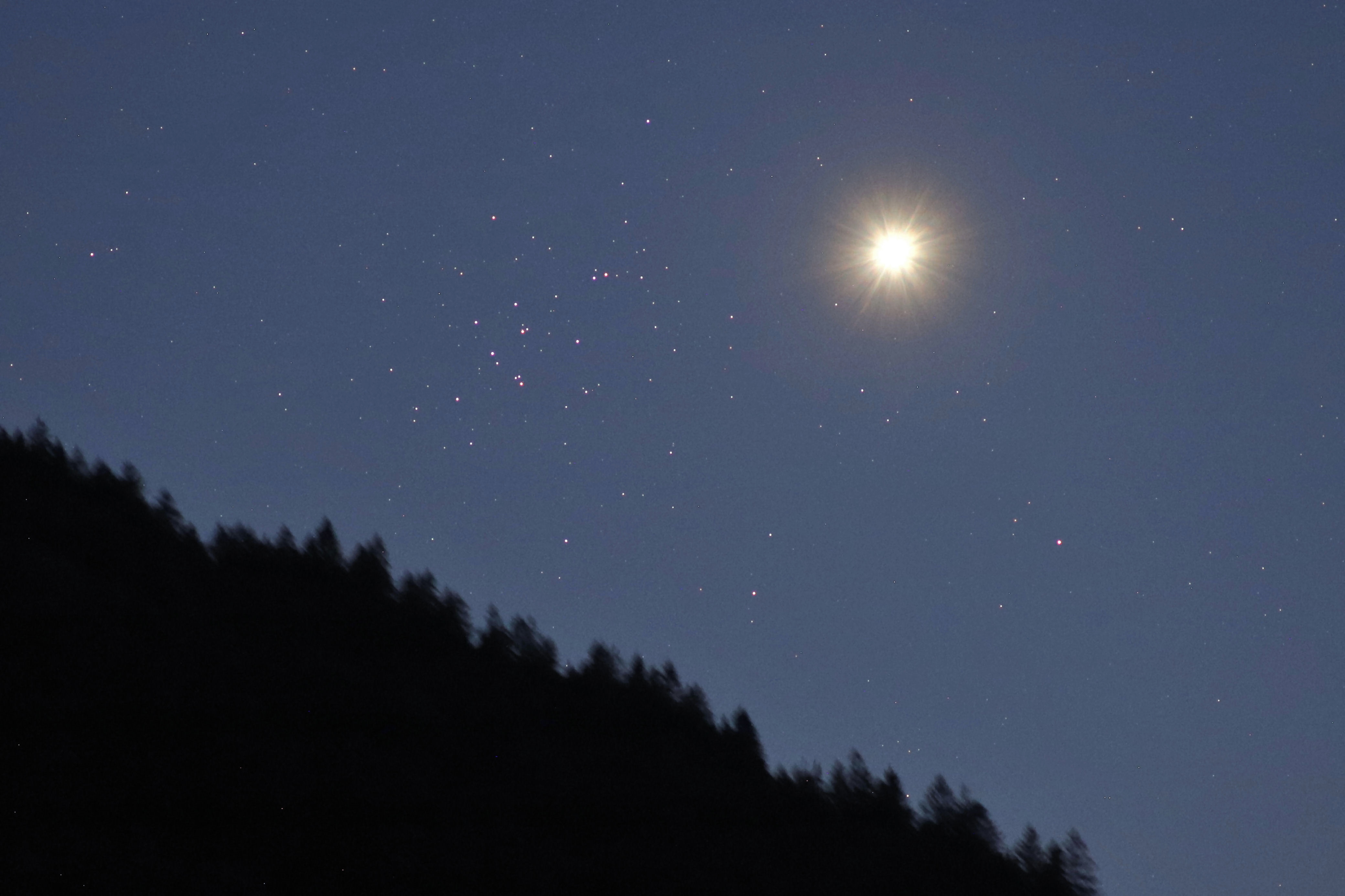 Am 12. Juni 2023 war Venus zum Zeitpunkt der Aufnahme rund 96 Millionen Kilometer von uns entfernt. Der Sternhaufen Messier 44 dagegen, befindet sich etwa 600 Lichtjahre tiefer im Raum dahinter.