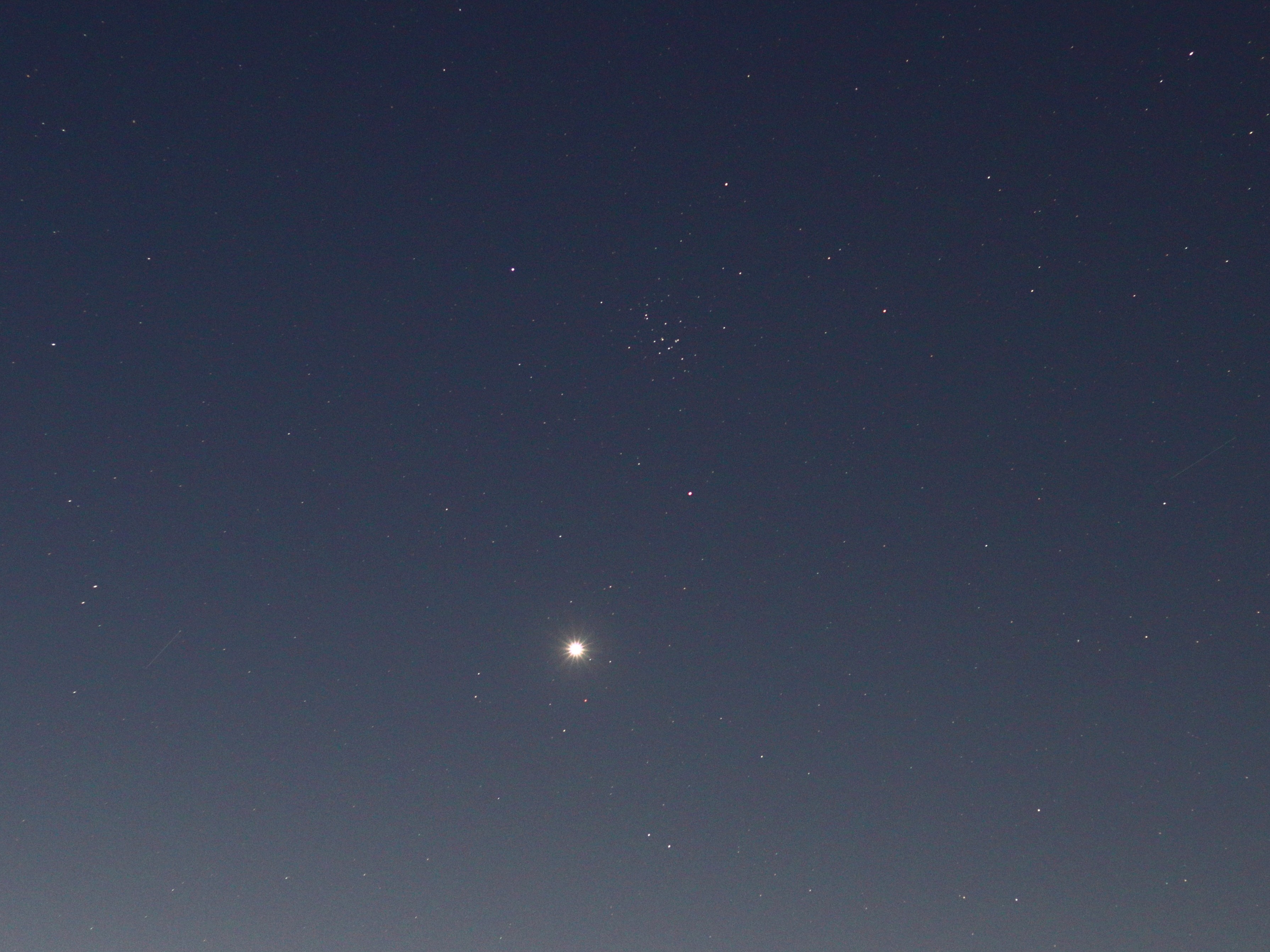 4. September 2025: Venus ist schon am Sternhaufen der Praesepe (M 44) vorbeigewandert. Durch den klaren Himmel war die Krippe als Wölkchen mit freiem Auge sichtbar, im Fernglas 8 x 30 schön als Sternhaufen neben der strahlenden Venus.