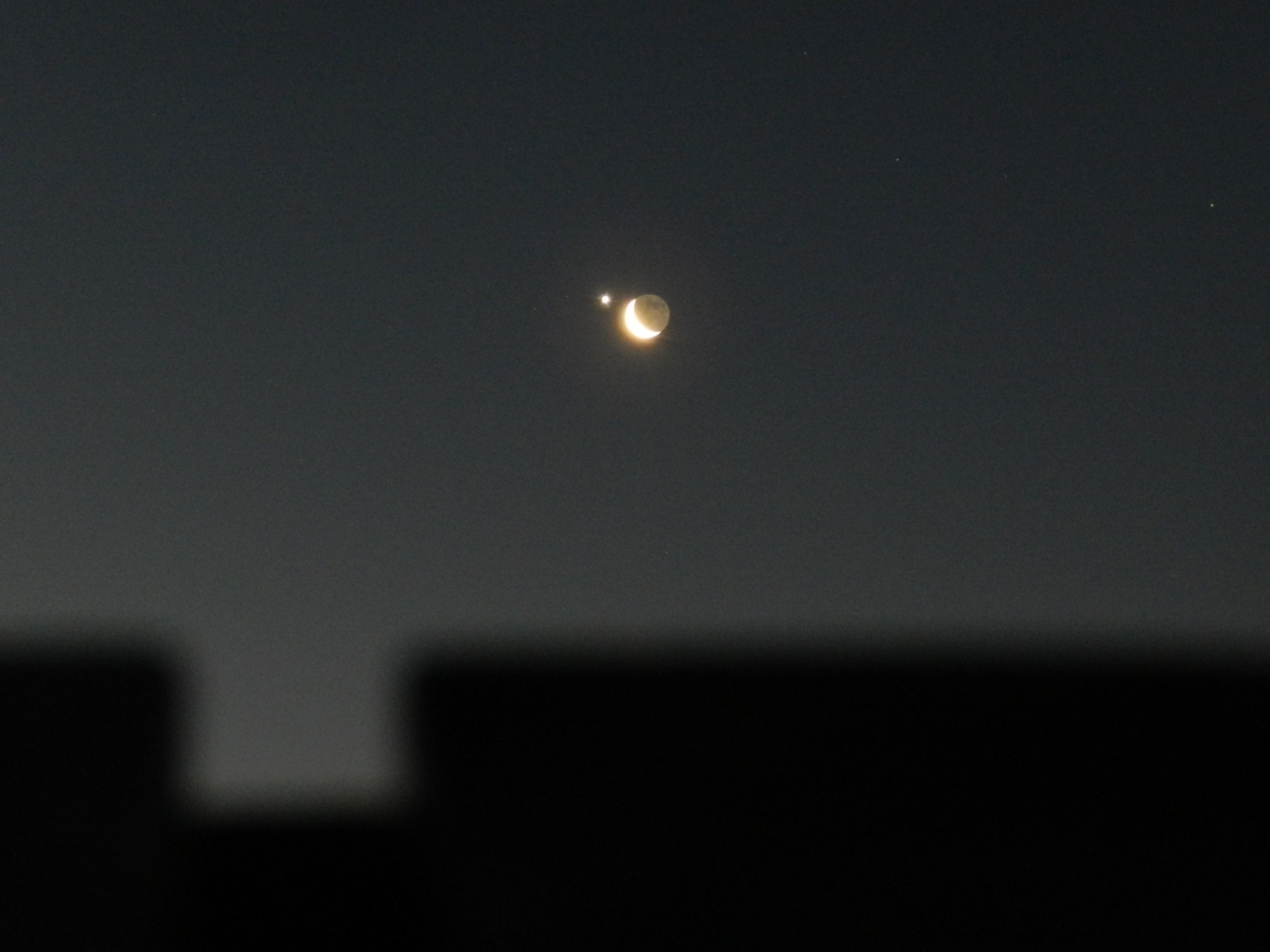 Am 26. Februar 2014 sah meine Frau vom Balkon unseres Hotels in Lara bei Antalya (Türkei) um 5 Uhr Ortszeit, also 4 Uhr MEZ, einen hellen Stern dicht neben dem Mond. Sie weckte mich und ich sagte ihr, dass kann nur die Venus sein. Ein wunderbar dichter Anblick. Ich hielt ihn mit meiner Kamera etwa 4:30 Uhr MEZ fest.