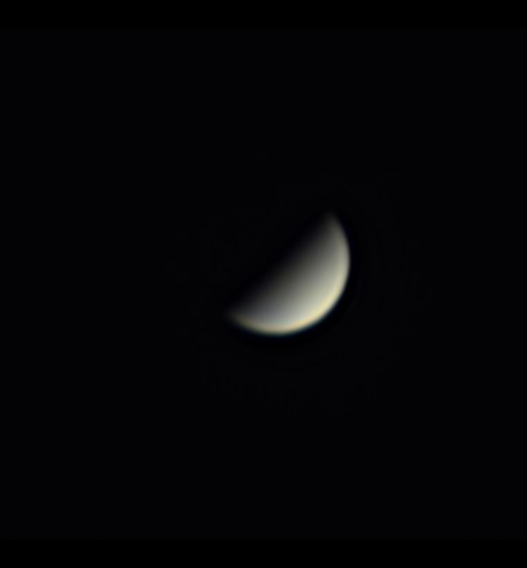 Am 2 Juni war der Himmel schön klar und in der Abenddämmerung konnte ich die Venus mit dem SC8 bei 2000 mm Brennweite und der ASI 178 festhalten. Genau halb beleuchtet mit 22 Bogensekunden Durchmesser laut Stellarium. 1600 Frames, davon 20 % verwendet und mit ASS2 und Registax bearbeitet.