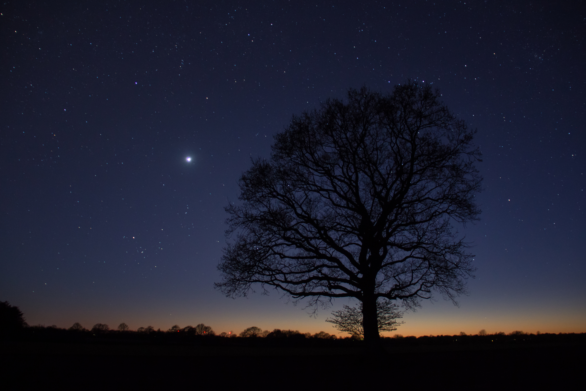 Zum Fotografieren der Starlink-Satelliten hatte ich mich auf einem Feld in der Nähe von Neumünster eingefunden. Im Vordergrund der Satellitenreihe wollte ich diesen einsamen Baum ablichten. Kaum angekommen überstrahlte jedoch die Venus die Szenerie. Beim Einrichten der Kamera entstand diese stimmungsvolle Aufnahme der Venus im Stier als »Testbild«.