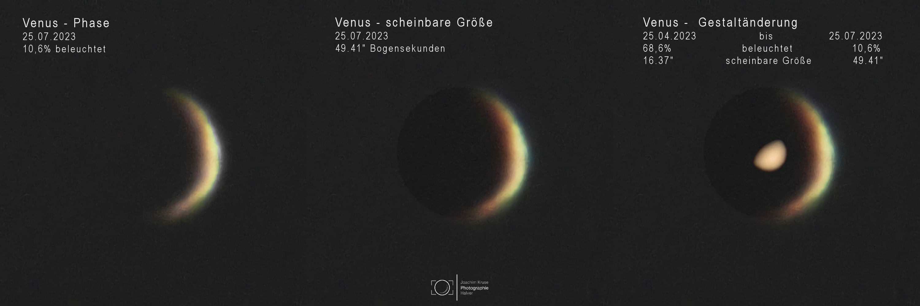 Es ist schon beachtlich, welchen Gestaltenwandel der Venus wir auf ihrer Reise um die Sonnenbahn auf unserer Erde beobachten können. Meines Erachtens sind es die größten visuellen Veränderungen, die sich schon mit relativ kleinen optischen Geräten in der Astrofotografie darstellen lassen. Neben der Phasengestalt, die wir natürlich beim Erdmond in einem wesentlich kürzerem Zyklus beobachten können, ist es vor allem auch die Größenänderung, die bei der Annäherung zur Erde beindruckt. In einem Vierteljahr Beobachtungszeit von der östlichen Elongation bis nahe zur unteren Konjunktion wuchs die scheinbare Größe des Planetenscheibchens um das Dreifache. Bis zum erreichen der maximalen Erdnähe am 13. August wird der visuelle Eindruck noch imposanter sein, aber die Beobachtung erschwert nun nicht nur der nahe Sonnenstand, sondern vor allem die in diesem Sommer vorherrschend launige Westwindwetterlage.