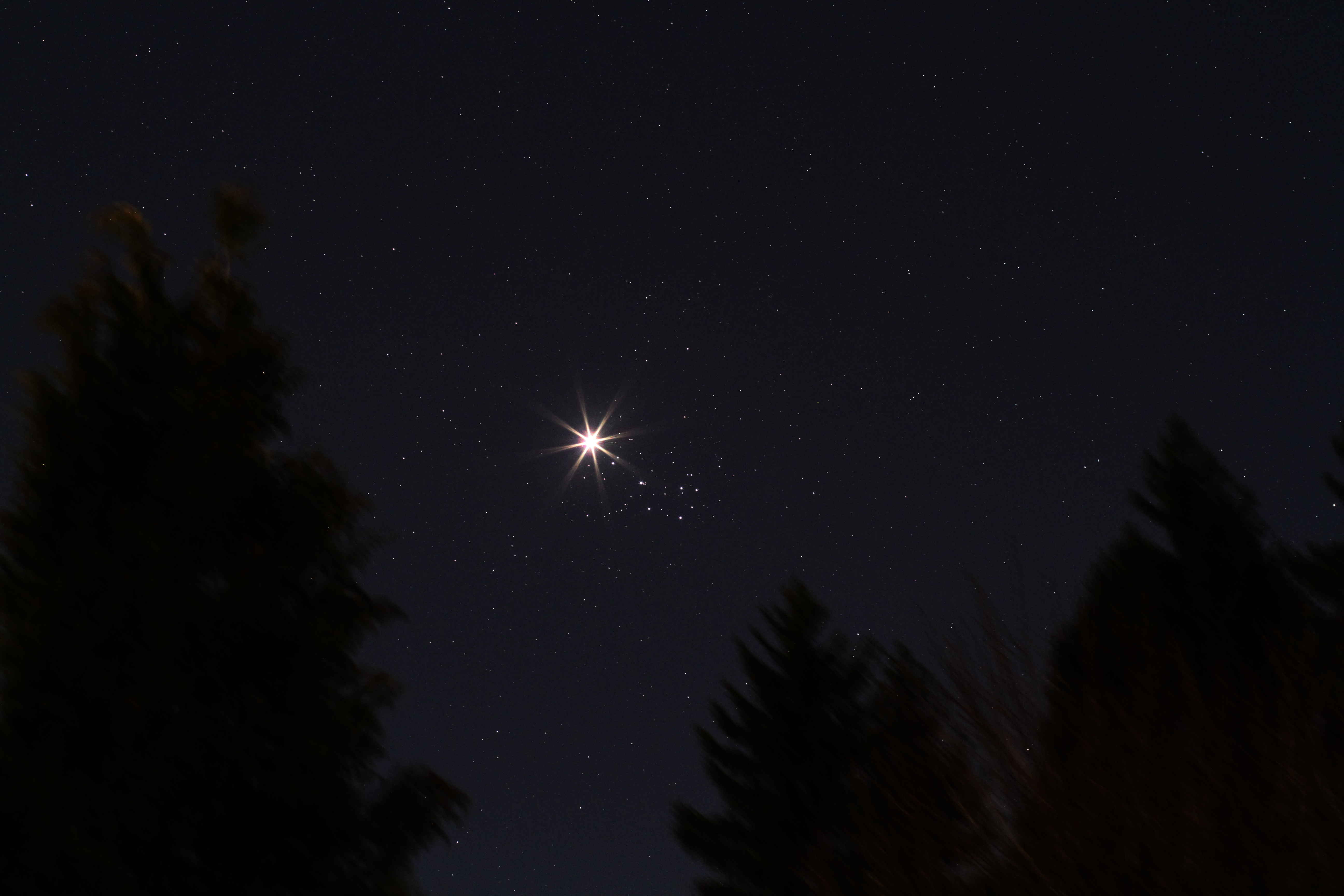 Ein beliebtes Fotomotiv dieser Tage ist die Venus, welche durch die Plejaden lief. Nachdem ich einige verschiedene Objektive ausprobiert hatte, gefielen mir die Ergebnisse mit 85 mm Brennweite doch am besten. Während die fotografischen Ergebnisse zufriedenstellend sind, so können sie doch bei Weitem nicht mit dem Anblick durch ein Fernglas mithalten, in welchem ich bei 16-facher Vergrößerung die Phase der Venus sowie viele Sterne der Plejaden sehen konnte. Das Auge verträgt eben doch deutlich mehr Helligkeitsunterschied als eine Kamera. Auch den 3-D-Effekt der Vordergrundbäume kann ein Bild nicht wiedergeben.