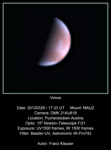 Die oft guten Bedingungen auf meiner Sternwarte im niederösterreichischen Alpenvorland auf 900 m Seehöhe nutzend, gelangen immer wieder detailreiche Venusaufnahmen bei Sonnenuntergang mit Aufnahmebrennweiten bis 14 m.