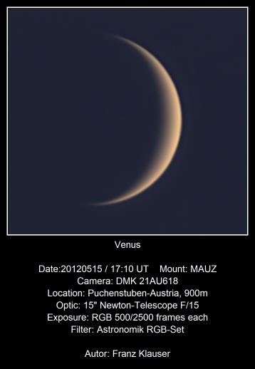 Zum Aufnahmezeitpunkt war die -4,4 mag helle Venus 0,35 AE (= 52,7 Millionen km) von der Erde und 0,72 AE von der Sonne entfernt. Bei einer Elongation von 29 Grad und 13,22 % Beleuchtung betrug der Durchmesser des Planetenscheibchens 47,36 Bogensekunden.