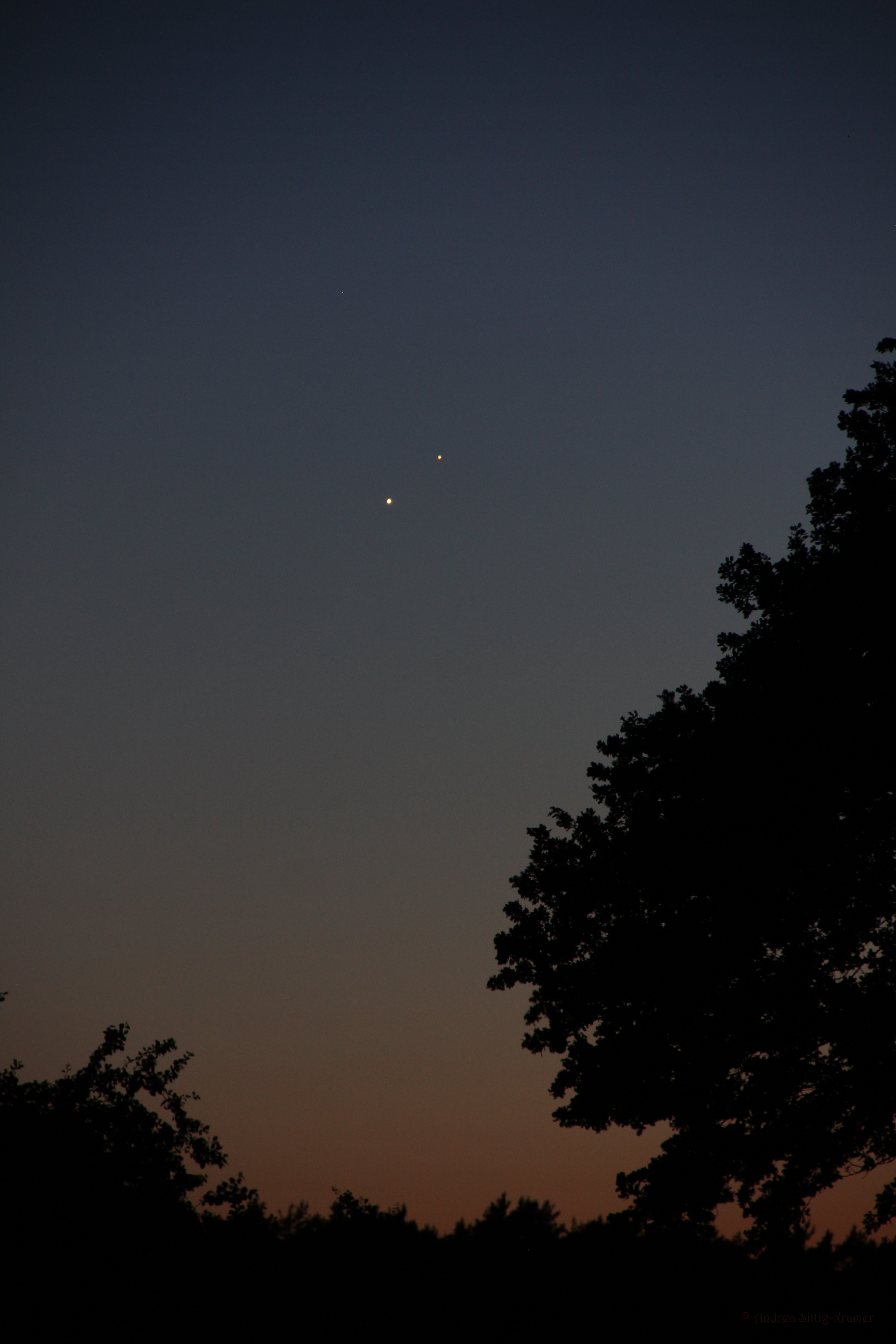 Die beiden hellsten Objekte am Abendhimmel sind zurzeit (neben dem Mond) eindeutig die Venus und der Jupiter. Am 1. Juli 2015 befanden sich die beiden Planeten in Konjunktion zueinander. Das heißt, sie standen von der Erde aus betrachtet scheinbar sehr eng zusammen. Die -4,4 mag helle Venus überholte den -1,8 mag hellen Jupiter. Der Abendstern stand dabei etwa eine Vollmondbreite unter Jupiter. Bei einem wolkenfreie Himmel und klarer Sicht war diese auffällige Planetenkonstellation in Uelzen kurz nach Sonnenuntergang ein atemberaubender Anblick.