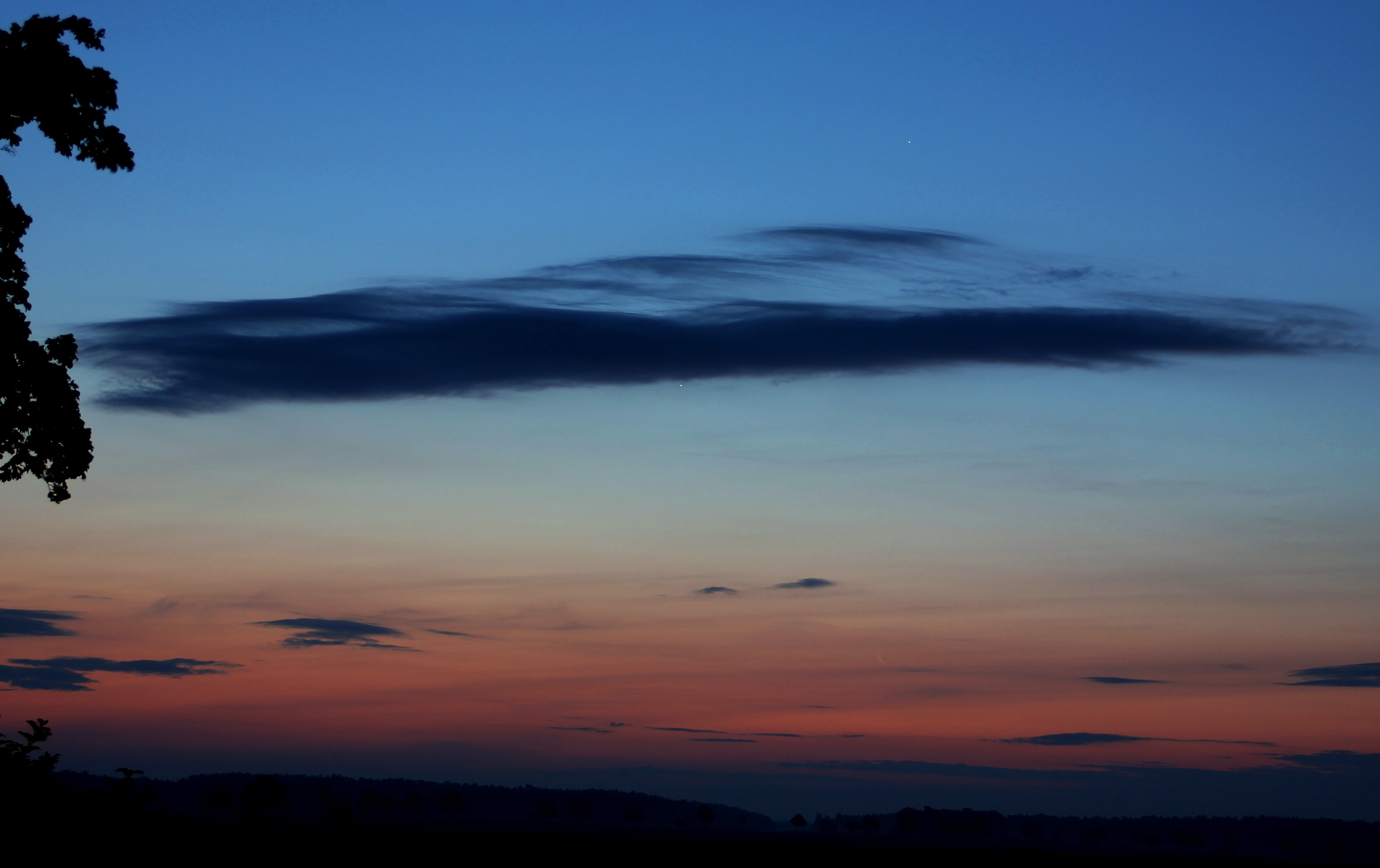Rechts unter der engen Konstellation von Venus und Jupiter zeigte sich um ca. halb 6 Uhr der zarte Umriss der superschmalen Mondsichel an einem spektakulären Morgenhimmel über Uelzen.