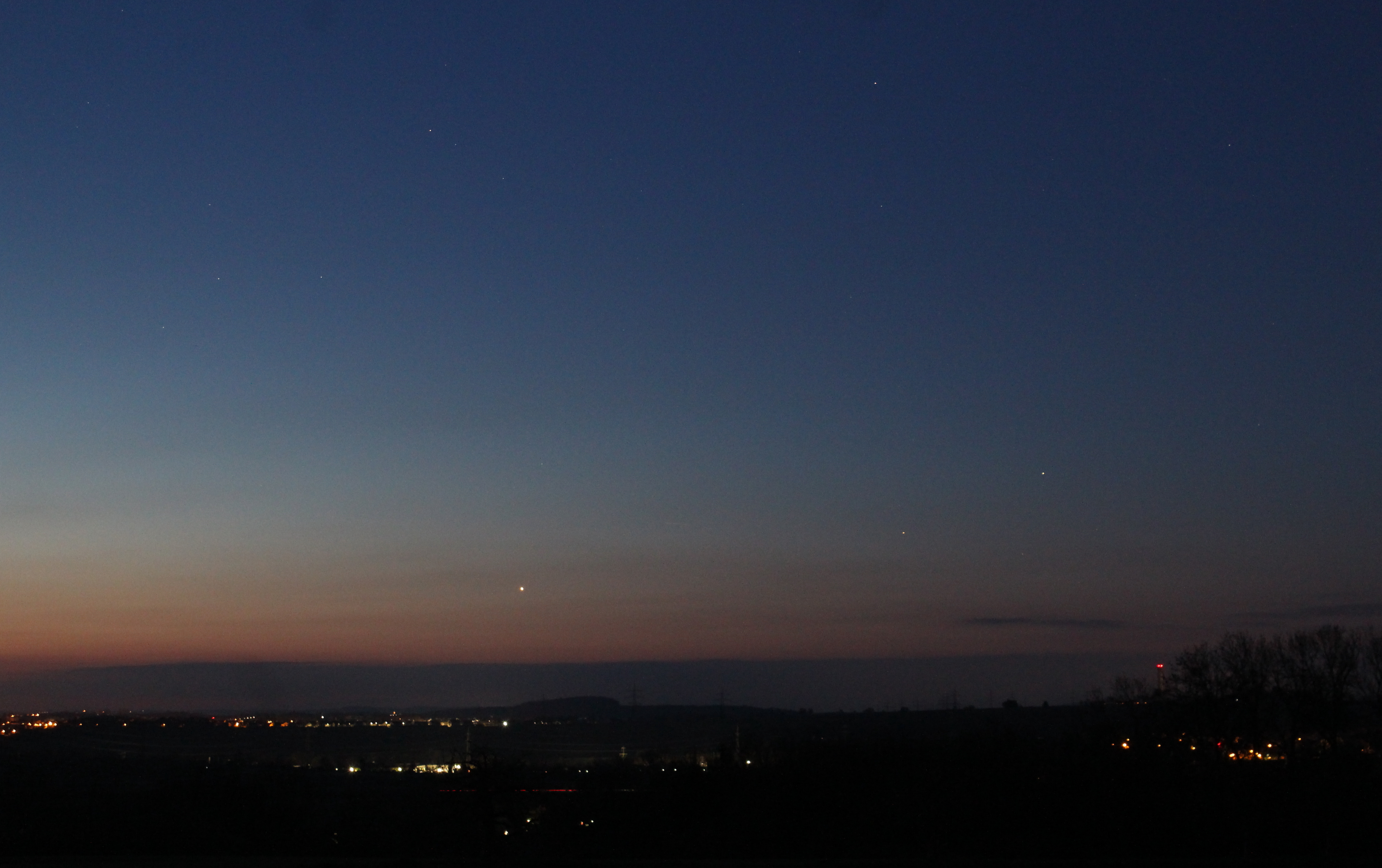Venus, Mars und Saturn am Morgenhimmel, aufgenommen in der Morgendämmerung nördlich von Freiberg am Neckar.