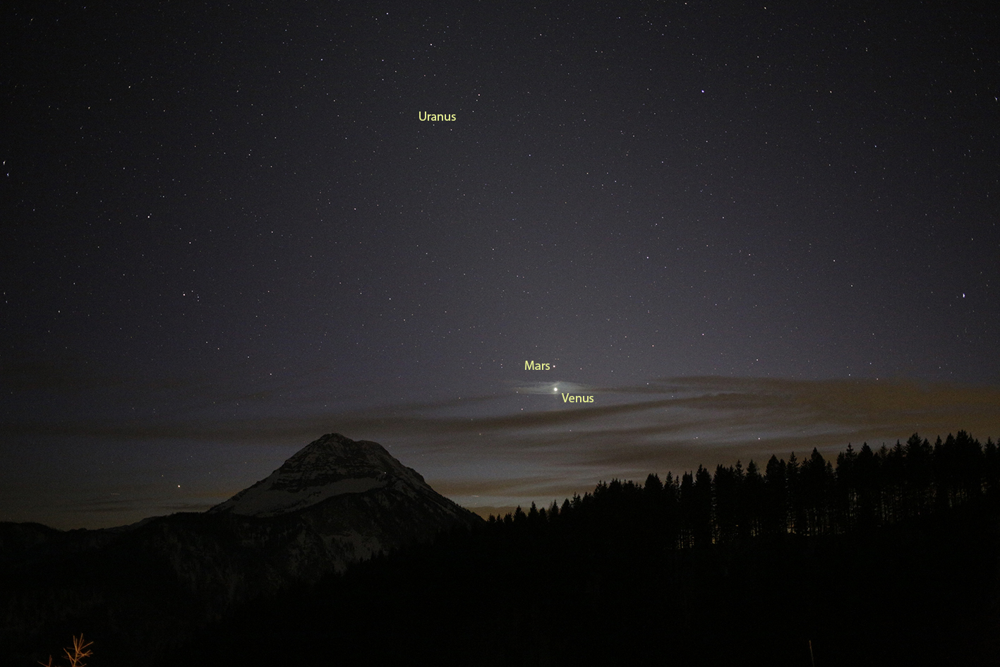 Am 10. Februar 2015 hatte ich es eigentlich nur auf Venus und Mars abgesehen. Bei Vergleich mit dem Planetariumsprogramm habe ich dann auch den schwachen Uranus gefunden.