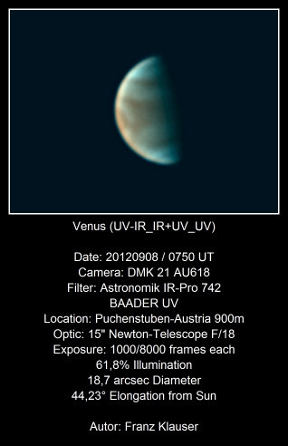 Die guten Bedingungen am Vormittag des 8. September 2012 erlaubten detailreiche Videos mit IR und UV-Filter. Zum Auffinden der Venus am Taghimmel bediente ich mich der Sonne als Referenz mit meiner GOTO-Montierung. Wolken sind meist nur mittels UV-Filter sichtbar. Das Bild zeigt daher sogenannte Falschfarben. Für Rot wurde das IR-Bild, für Blau das UV-Bild verwendet, das synthetische Grün entstand aus IR+UV. Die Luminanz ist das UV-Bild.
