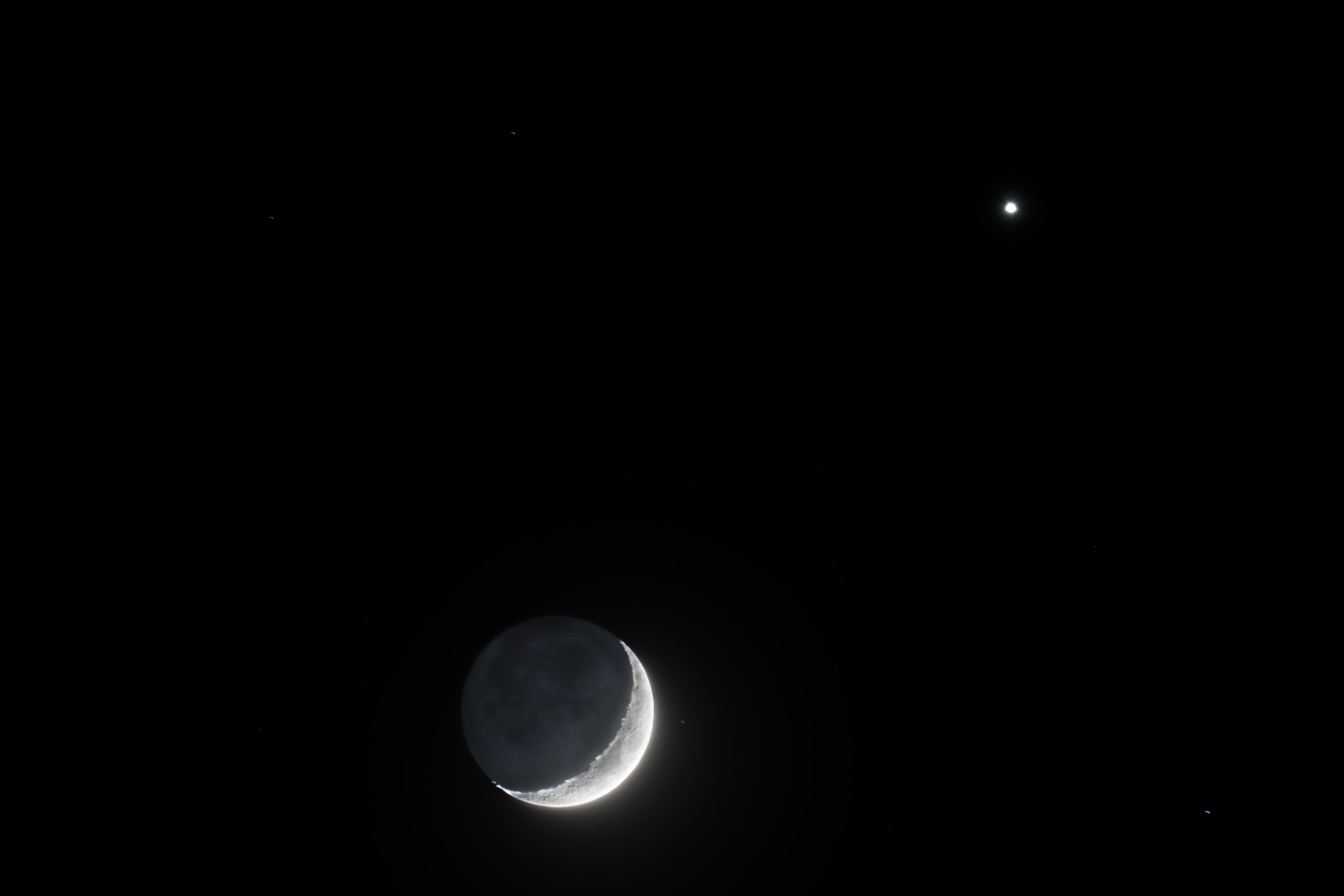 Venus-Mond-Konjunktion am 3. Januar 2025. Leider war es diesig und kurz nach der Aufnahme schoben sich Wolken vor den Mond.