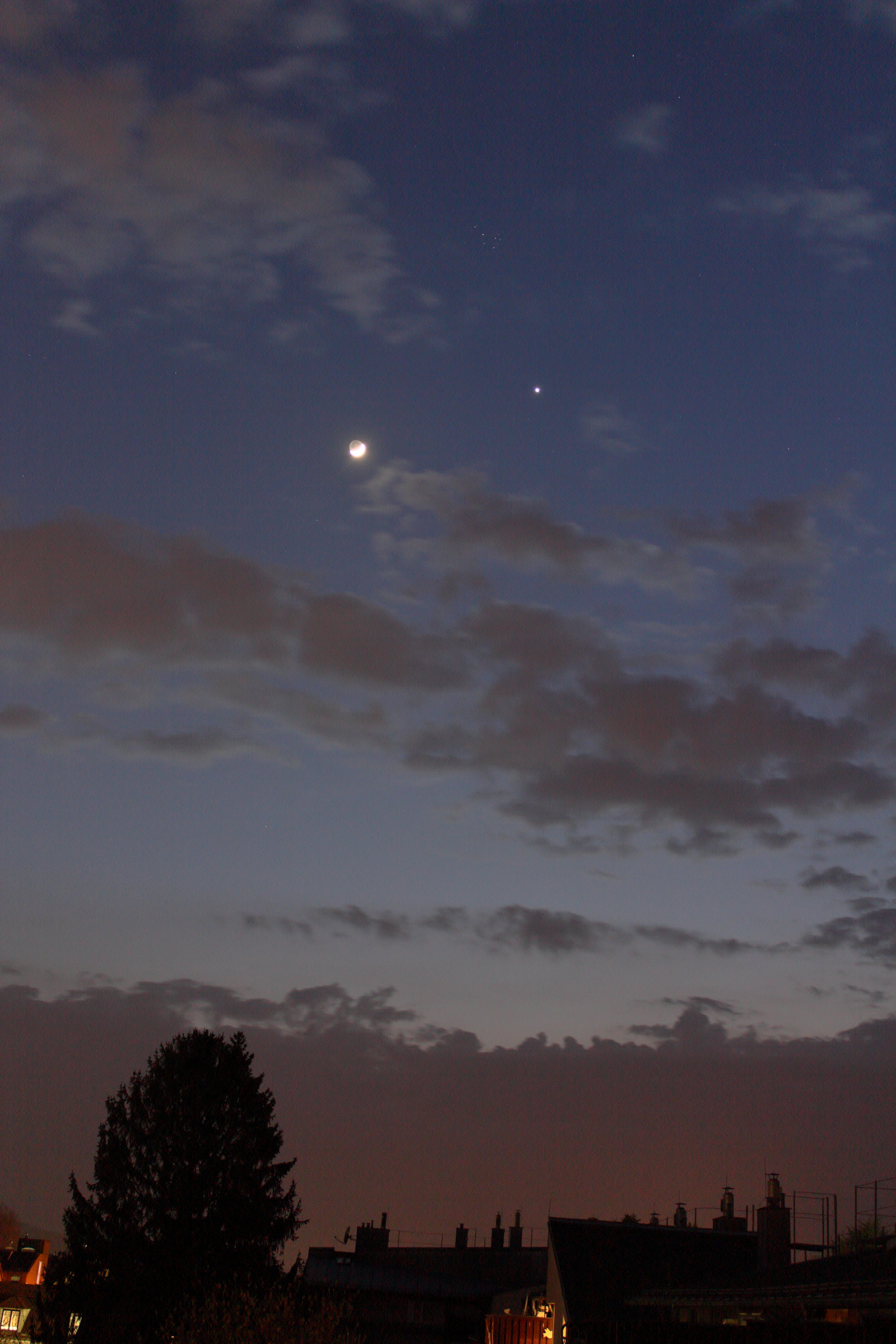Venus und Mond waren heute schon ab 18:30 Uhr beim Abendspaziergang wunderschön zu sehen. Danach zogen immer mehr Wolken auf, gaben aber doch immer wieder den Blick auf die beiden und das nahe Siebengestirn frei.