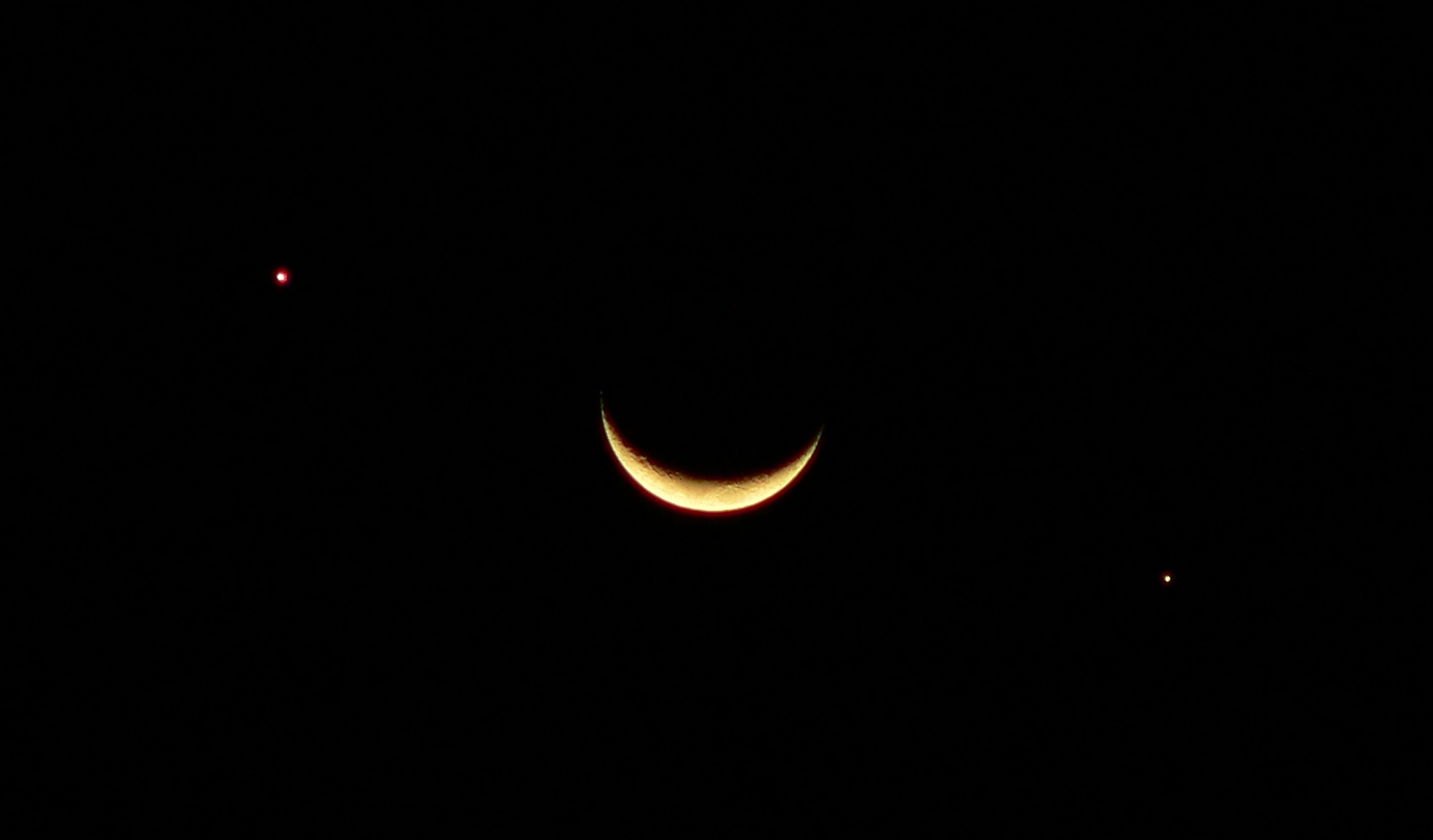Am ersten Abend meines damaligen Urlaubs ergab sich diese seltene und reizvolle Konstellation des zunehmenden Mondes, flankiert von Venus (links) und Jupiter (rechts).