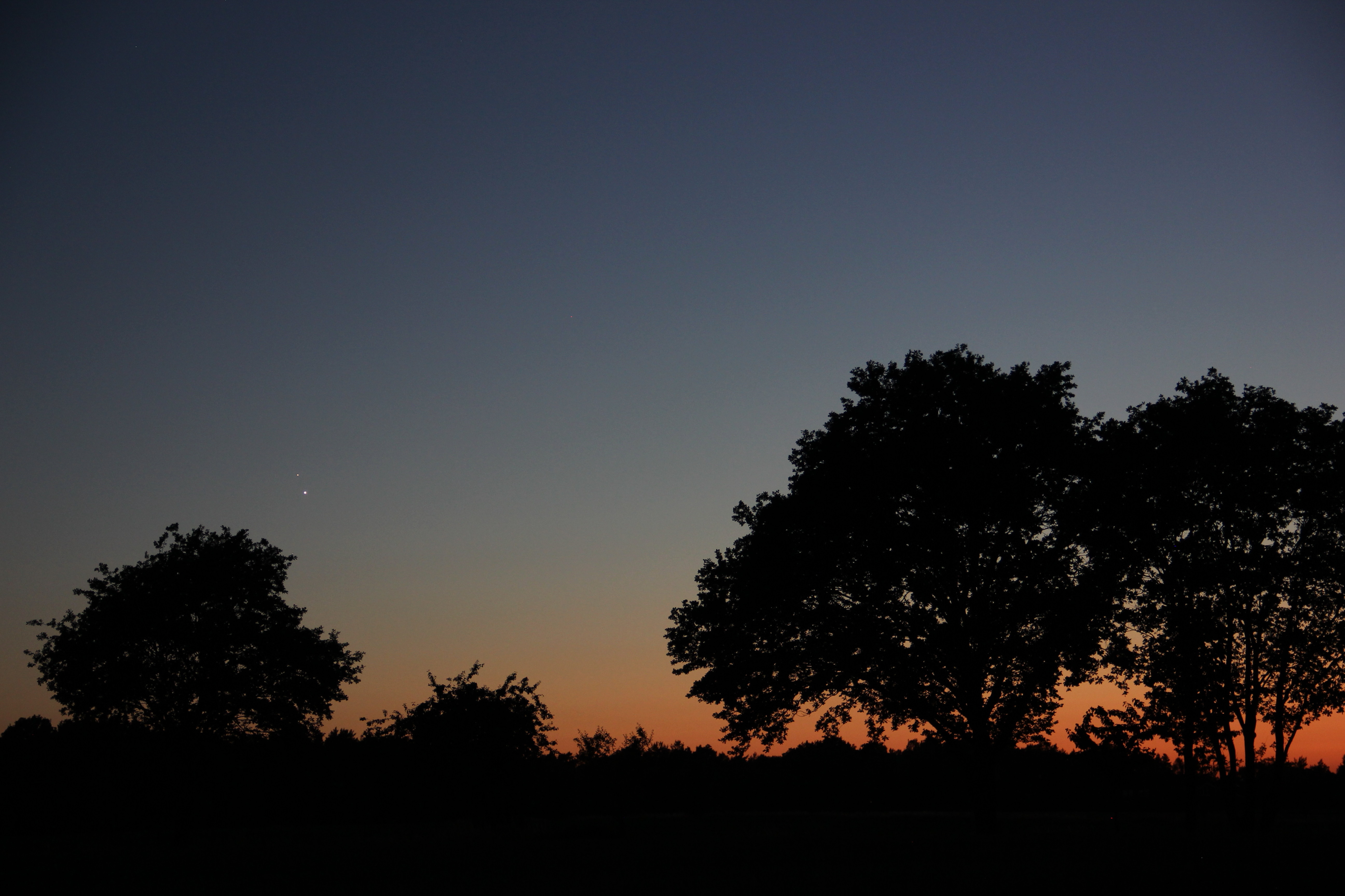 Die -4,4 mag helle Venus "überholt" in diesen Tagen den -1,8 mag hellen Jupiter. Am 1. Juli 2015 werden sich die beiden Planeten in Konjunktion zueinander befinden. Das heißt, sie sind von der Erde aus betrachtet scheinbar sehr eng zusammen. Der "Abendstern" stand auch schon am 30. Juni 2015 etwa eine Vollmondbreite unter dem Jupiter. Bei einem wolkenfreie Himmel und klarer Sicht war diese auffällige Planetenkonstellation in Uelzen während und kurz nach Sonnenuntergang ein wunderschöner Anblick.