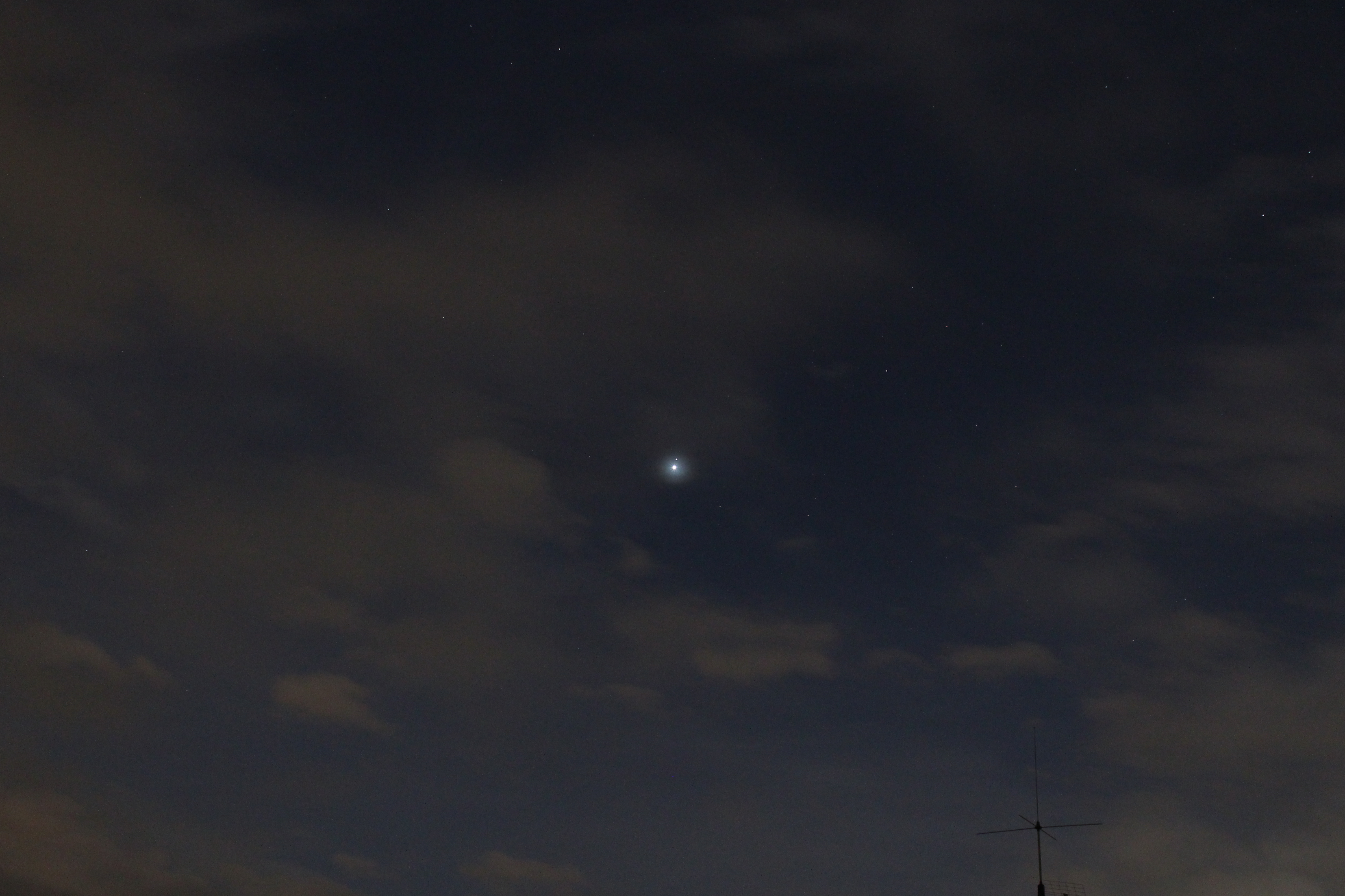 Zuerst sah es so aus, daß ich die enge Konjunktion zwischen Venus und Regulus am Morgen des 3. Oktober 2020 nicht beobachten können werde, denn am Himmel herrschte eine geschlossene Wolkendecke. Doch dann kamen plötzlich Wolkenlücken auf und ich konnte den Morgenstern sehen, worauf ich sofort meine Kamera holte und einige Bilder machte.