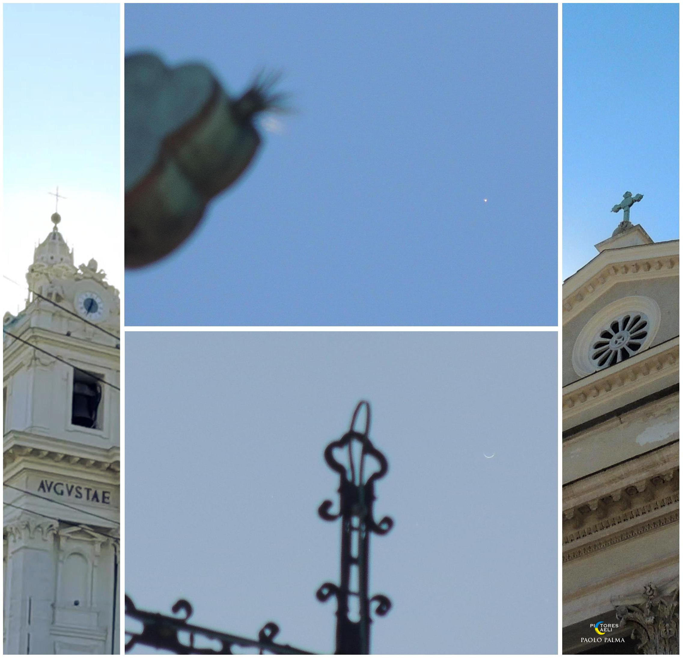 Venus in conjunction with the Sun, next to two Italian Churches and in daytime. Single snaps without any telescope. The little crescent shape you can see here isn’t the Moon, it’s Venus as observed in daytime. Venus in fact is so bright that you can see it in daylight - if you know where to find it - and often even when it is nearest to the Sun, with the right precautions. The bottom photo in fact was snapped near noon on January 8, 2022, only a few hours after Venus' inferior conjunction of 2022. The planet was almost exactly between the Sun and the Earth and only 5 degrees away from the solar disk. I was able to detect it through a binocular and photograph it by hiding the Sun behind the globe placed atop the Church of Santa Maria del Buon Consiglio in Naples, Italy ( here visible on the left).