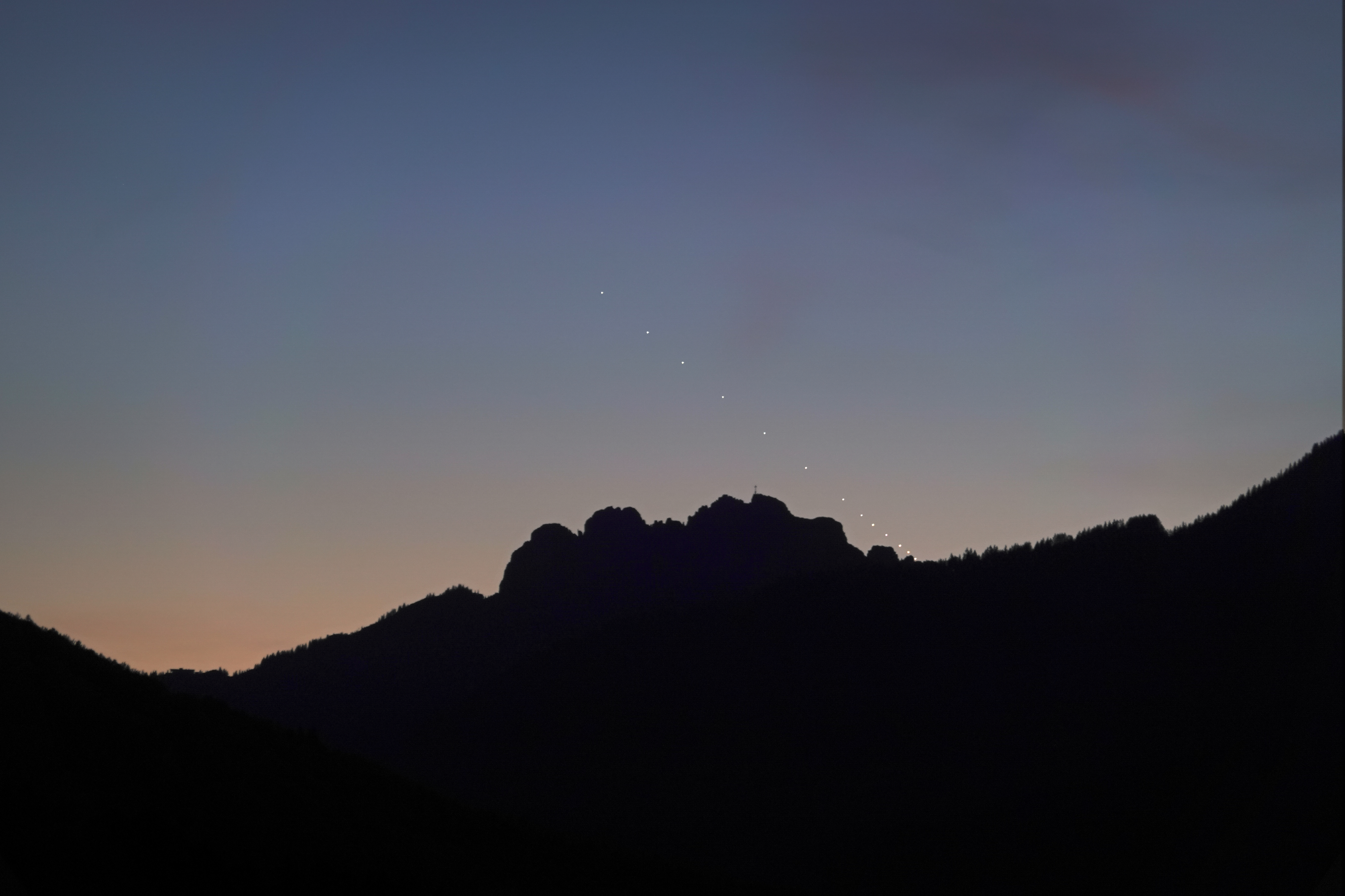 Die Kampenwand mit seinem Gipfelkreuz ist eins der Wahrzeichen der Chiemgauer Alpen. Das Spektakel der Venus über dem markanten Gipfelgrat war der perfekte Abschluss eines Wandertags bei bestem Wetter.