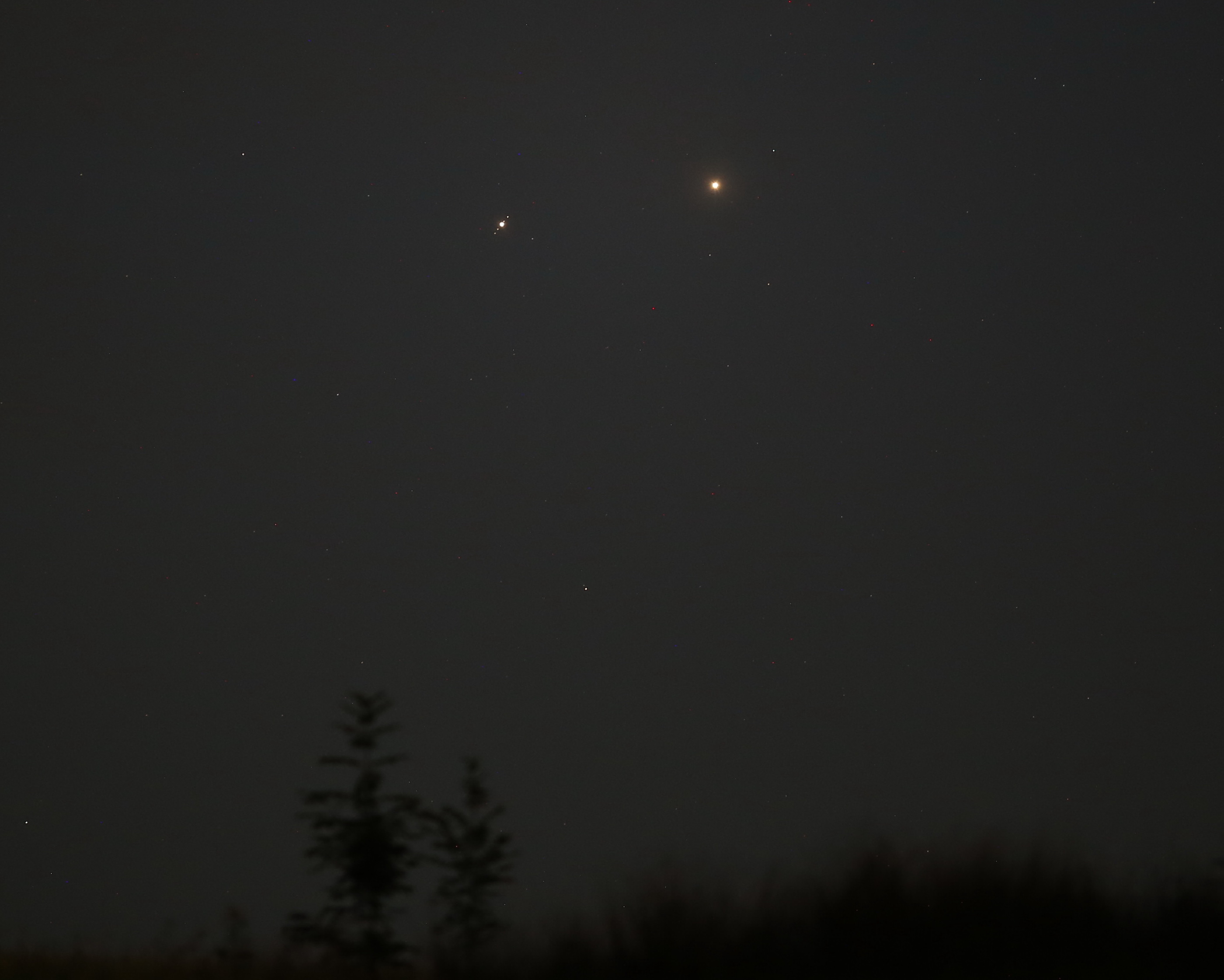 In den nächsten Tagen wird sich die Venus am Morgenhimmel weiter dem Jupiter nähern und unten vorbeiwandern, kleinster Abstand am 12. August. Meine erste Aufnahme stammt vom 11., 4 Uhr morgens. Zum diesem Zeitpunkt war der Jupiter von uns 891 Millionen Kilometer (49,5 min Lichtzeit), die Venus nur 184 Millionen Kilometer (10 min Lichtzeit) entfernt. Also Wecker stellen ! Ist auch mit freiem Auge wunderschön. Man braucht den Nordosthimmel !