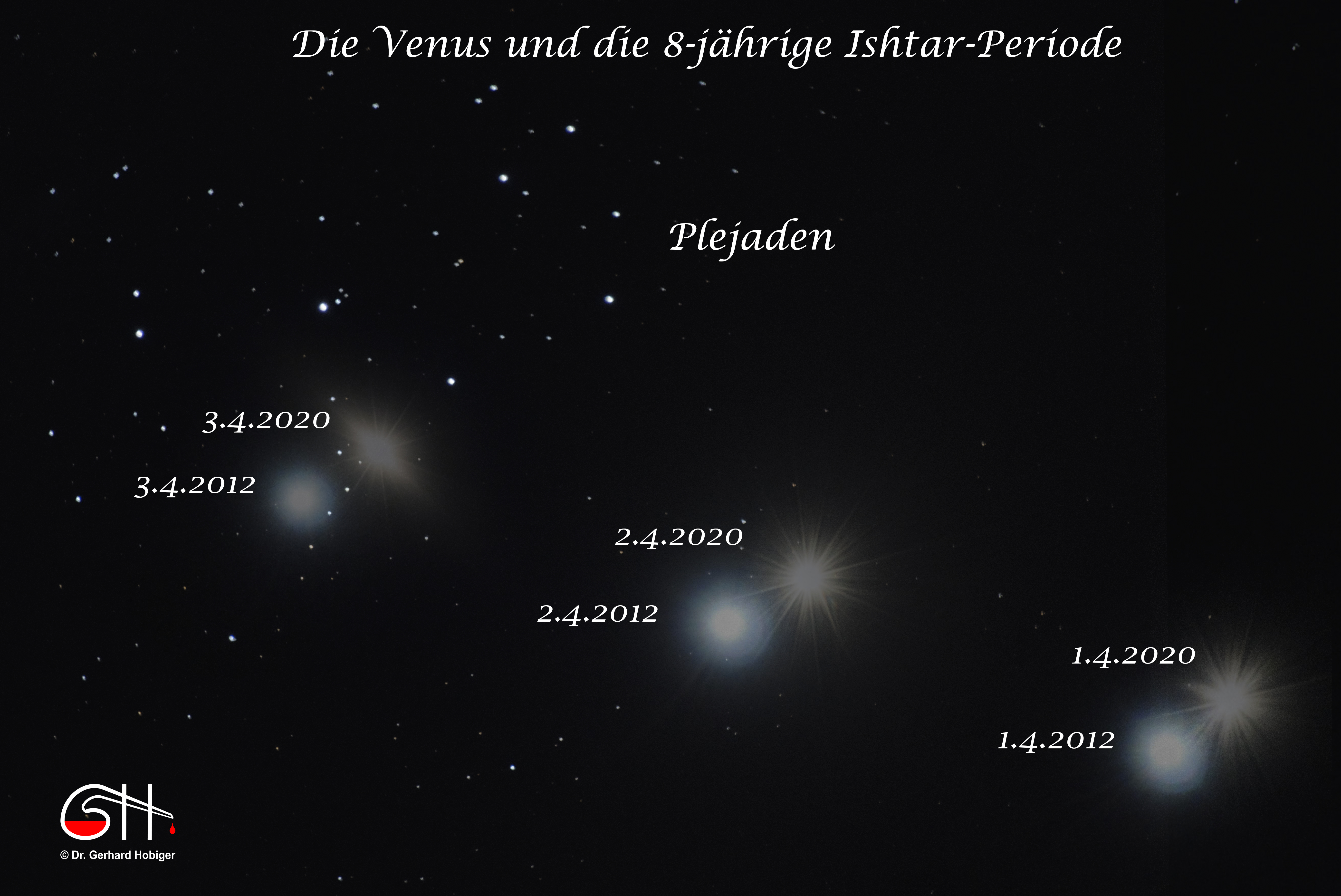 Heuer ist die Venus wieder bei den Plejaden vorbeigezogen. Als ich in meinem Archiv nachsah, fand ich Aufnahmen, die ich genau vor 8 Jahren von der selben Konstellation ebenfalls fotografierte. Nach einiger Internetrecherche, fand ich, dass sich die Sichtbarkeitsperioden der Venus im 8-Jahreszyklus wiederholen. Daher legte ich meine Aufnahmen übereinander und konnte diese sogenannte Isthar Periode der Venus im Bild festhalten.
