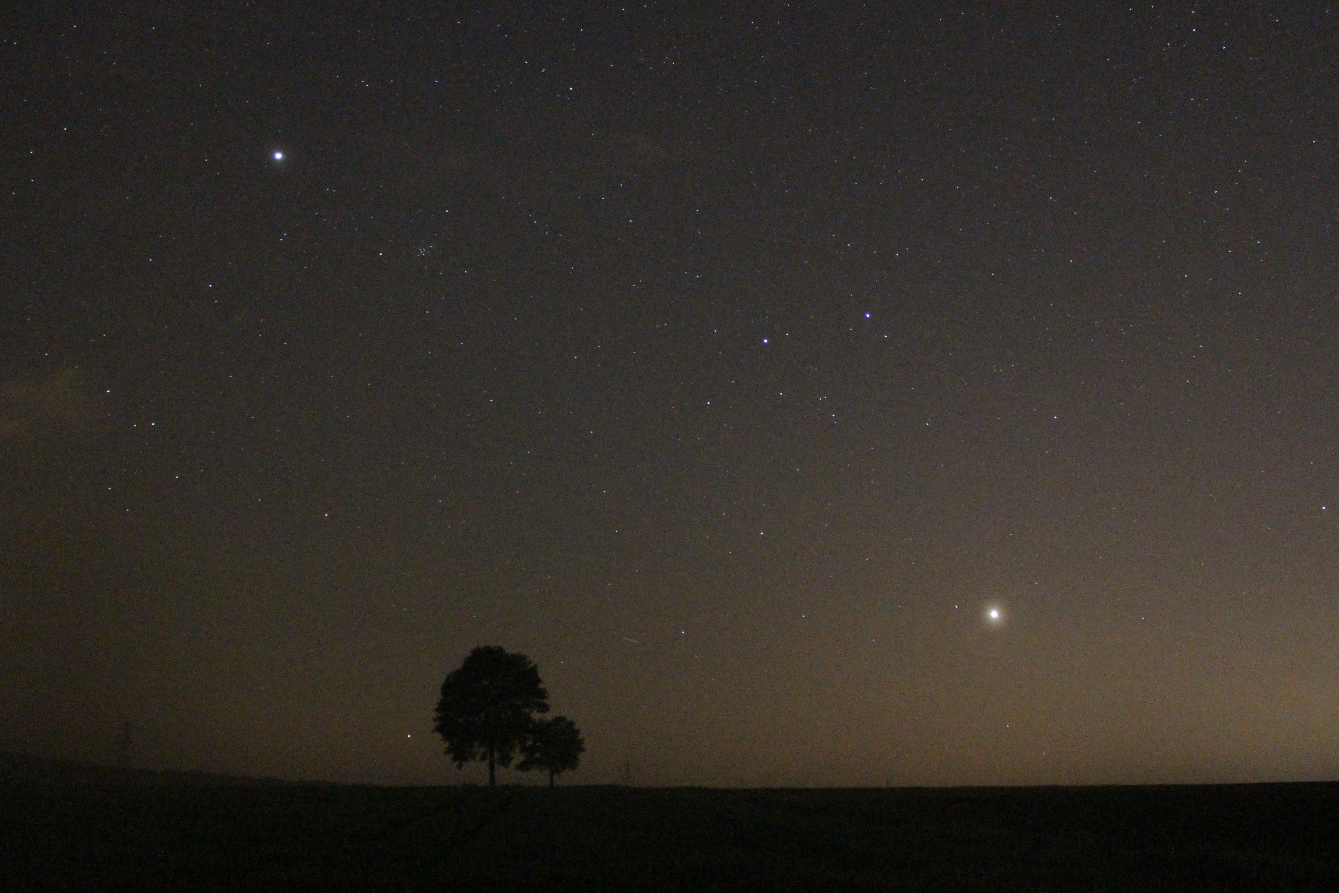 Venus und Jupiter haben inzwischen ihren scheinbaren Abstand am Himmel so weit verringert, daß es möglich ist, beide Planeten auf ein Bild zu bannen, was ich am Abend des 15.5.2015 in der Nähe von Walddorf-Häslach tat.