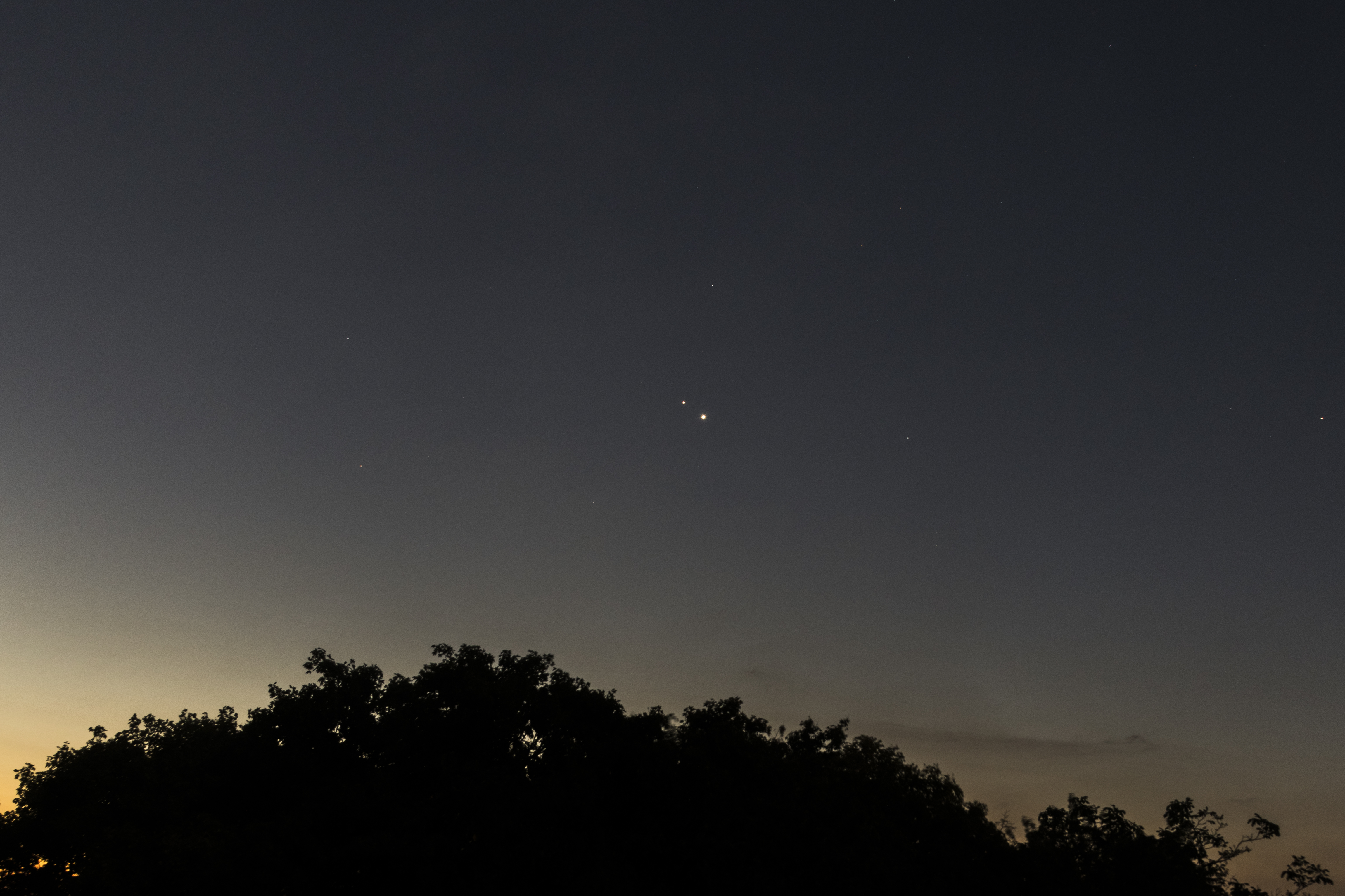 Am 12. August 2025 waren die Planeten Venus und Jupiter in Konjunktion. Solch ein Ereignis ist durch die Helligkeit der beiden Planeten sehr auffällig. Noch dazu spielte sich das in den Zwillingen ab, was einen besonders schönen Anblick bietet.