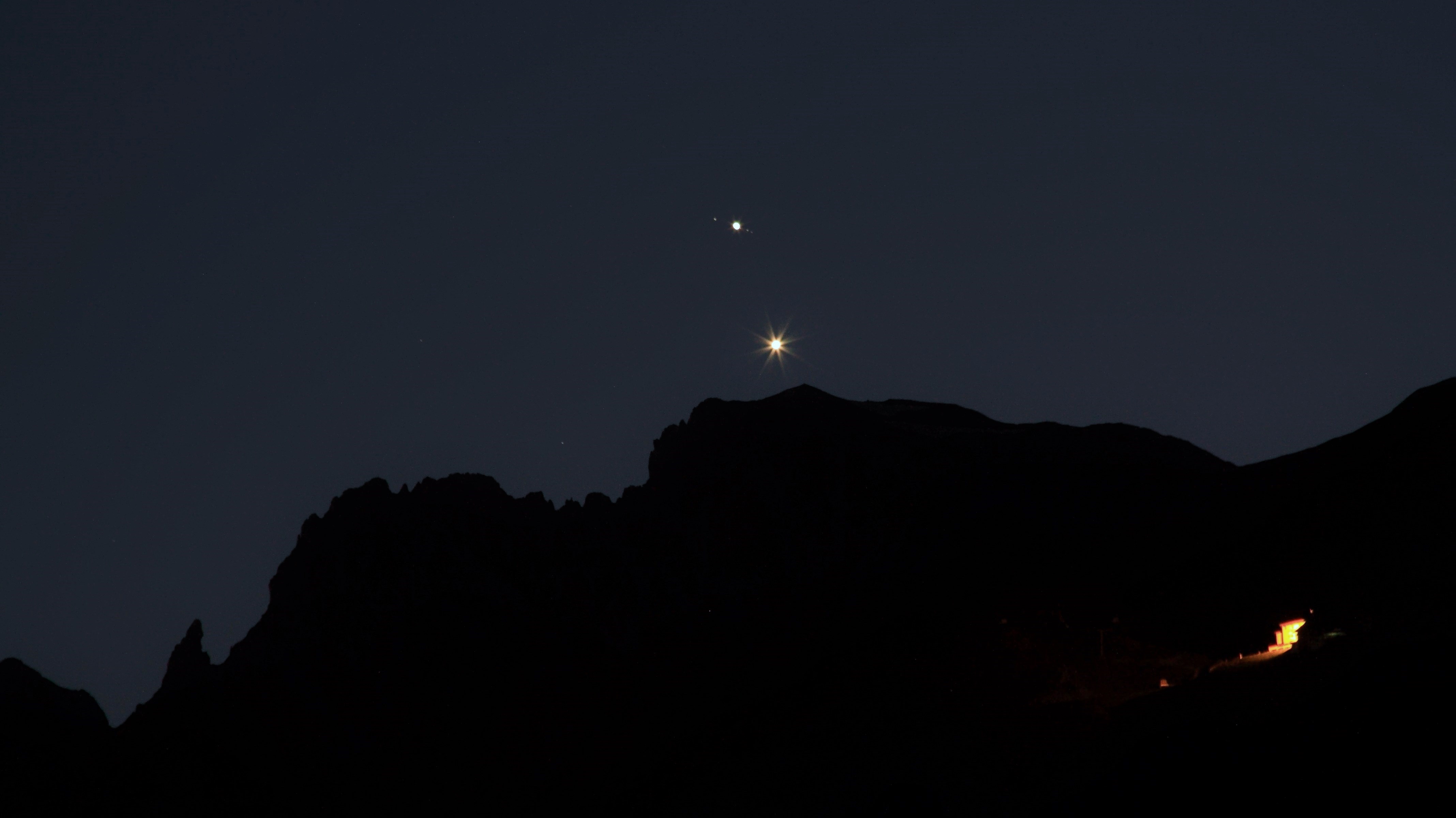 Venus und Jupiter in engem Abstand kurz vor ihrem Untergang hinter der Nordkette über Innsbruck/Tirol.