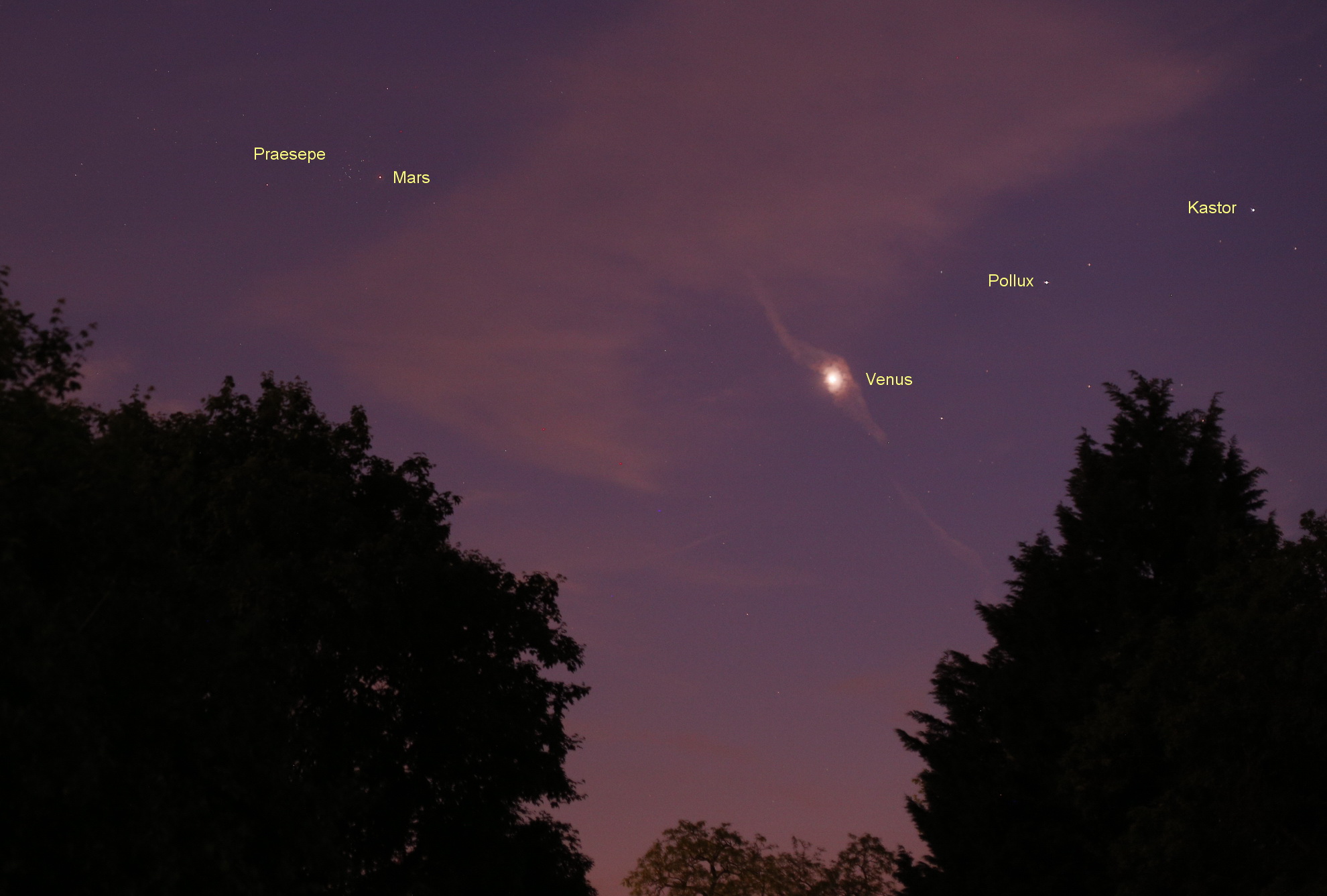 Die Venus steht noch in den Zwillingen, der Mars hat bereits den Sternhaufen Praesepe in der Krippe erreicht.