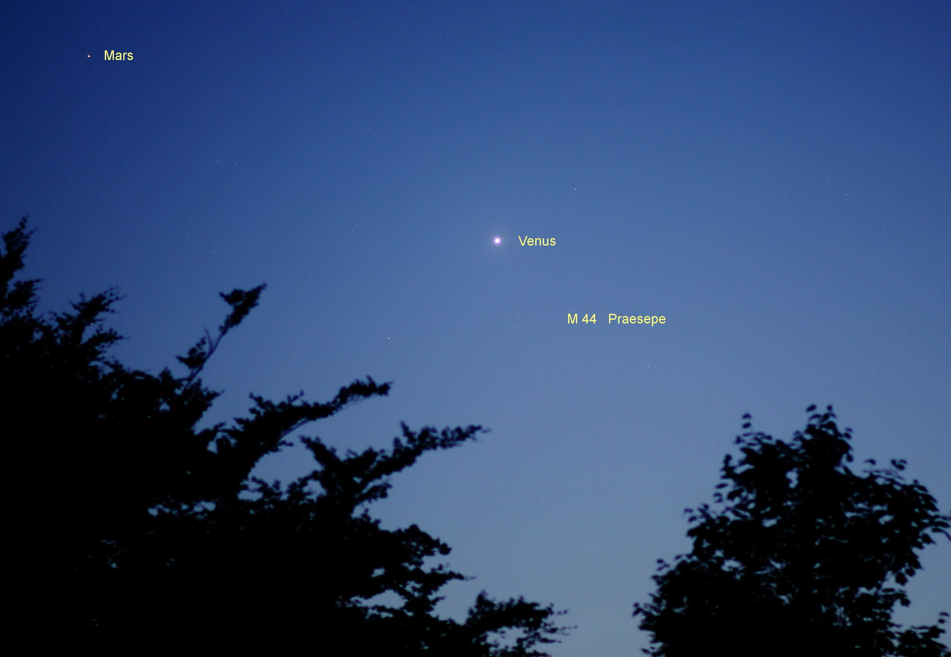 Venus hat am 14. Juni 2023 den Sternhaufen M 44 (Praesepe) passiert und zieht weiter durch das Sternbild Krebs. Aufnahme mit 85 mm Brennweite.