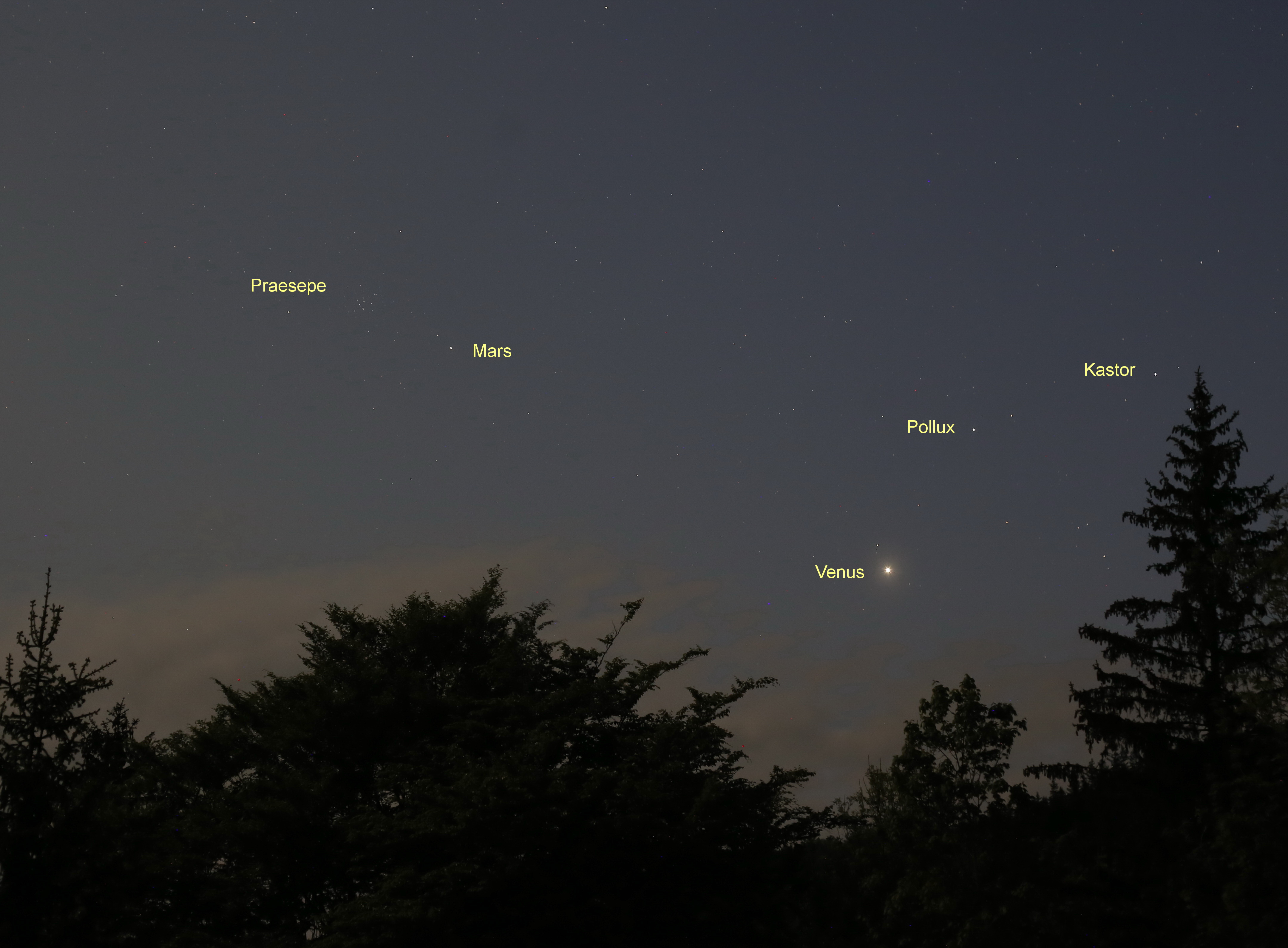 An den letzten Abenden (28. bis 30. Mai) konnte man sehr deutlich das Vorbeiwandern der Venus am Stern Kappa Geminorum (links unterhalb der beiden Kopfsterne Kastor und Pollux in den Zwillingen) verfolgen.