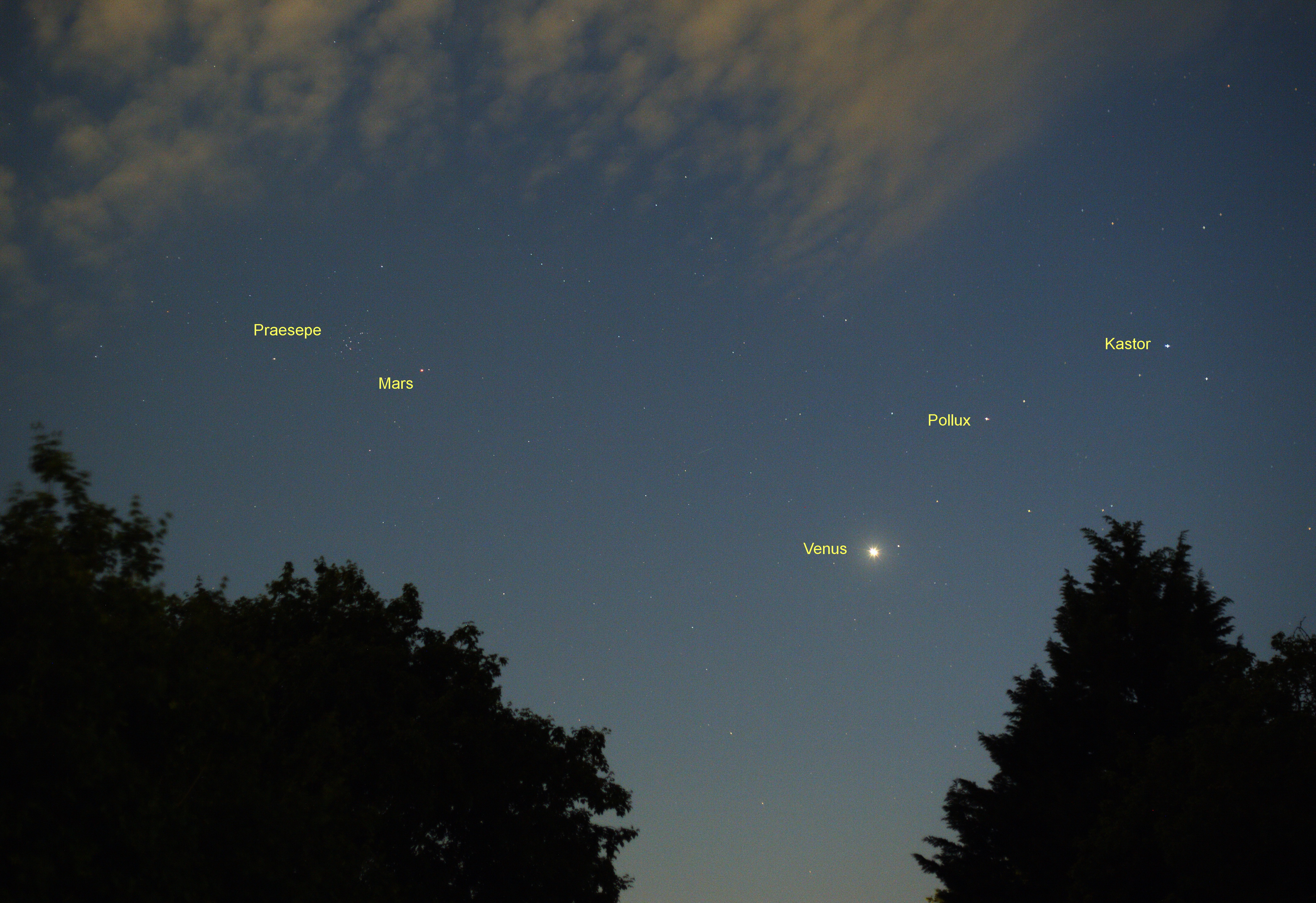 An den letzten Abenden (28. bis 30. Mai) konnte man sehr deutlich das Vorbeiwandern der Venus am Stern Kappa Geminorum (links unterhalb der beiden Kopfsterne Kastor und Pollux in den Zwillingen) verfolgen. Kappa Geminorum ist ein Doppelstern, 141 Lichtjahre von uns entfernt.