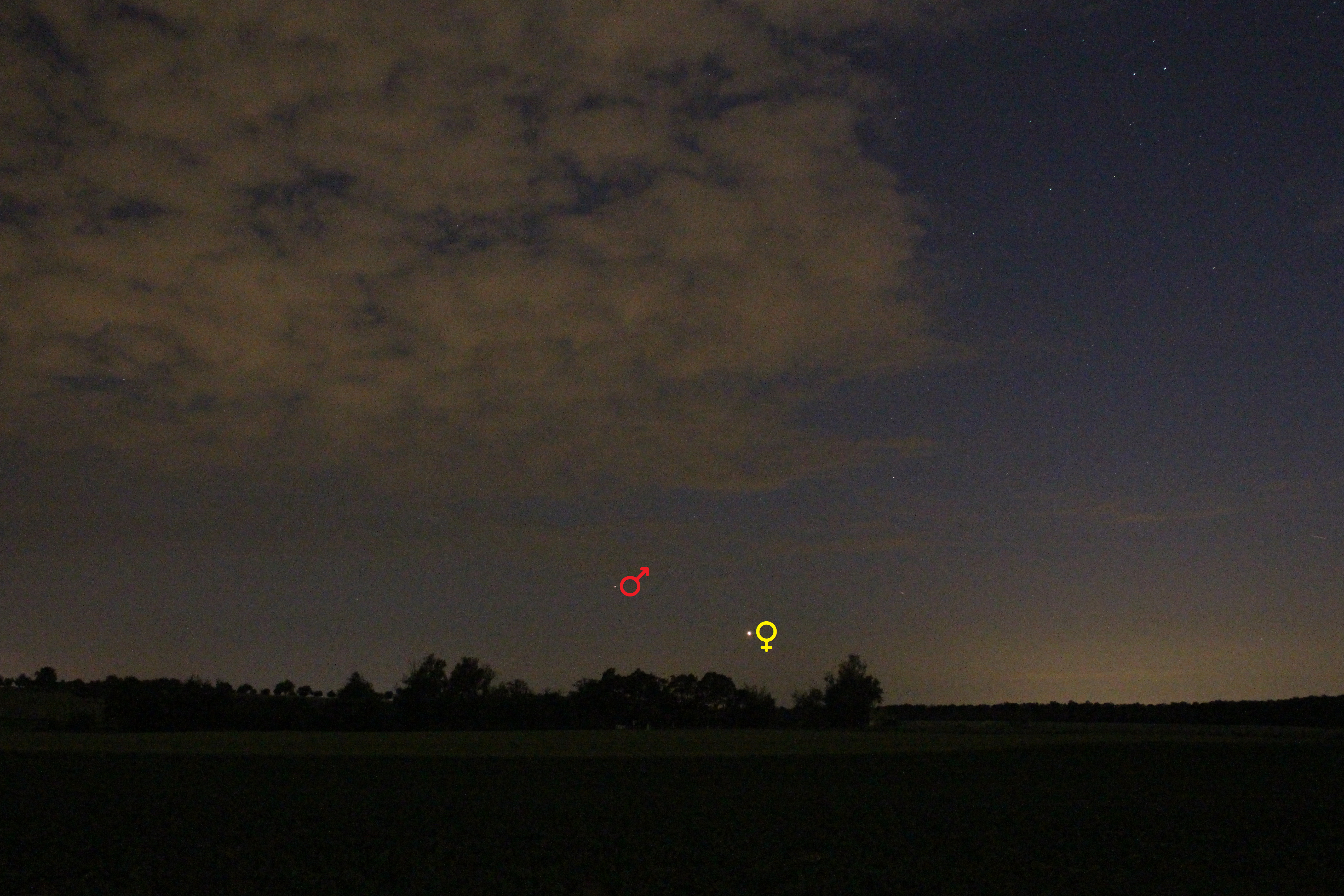 Venus und Mars am Abendhimmel, aufgenommen bei teilweise wolkenverhangenen Himmel westlich des Sindelfinger Ortsteils Maichingen.