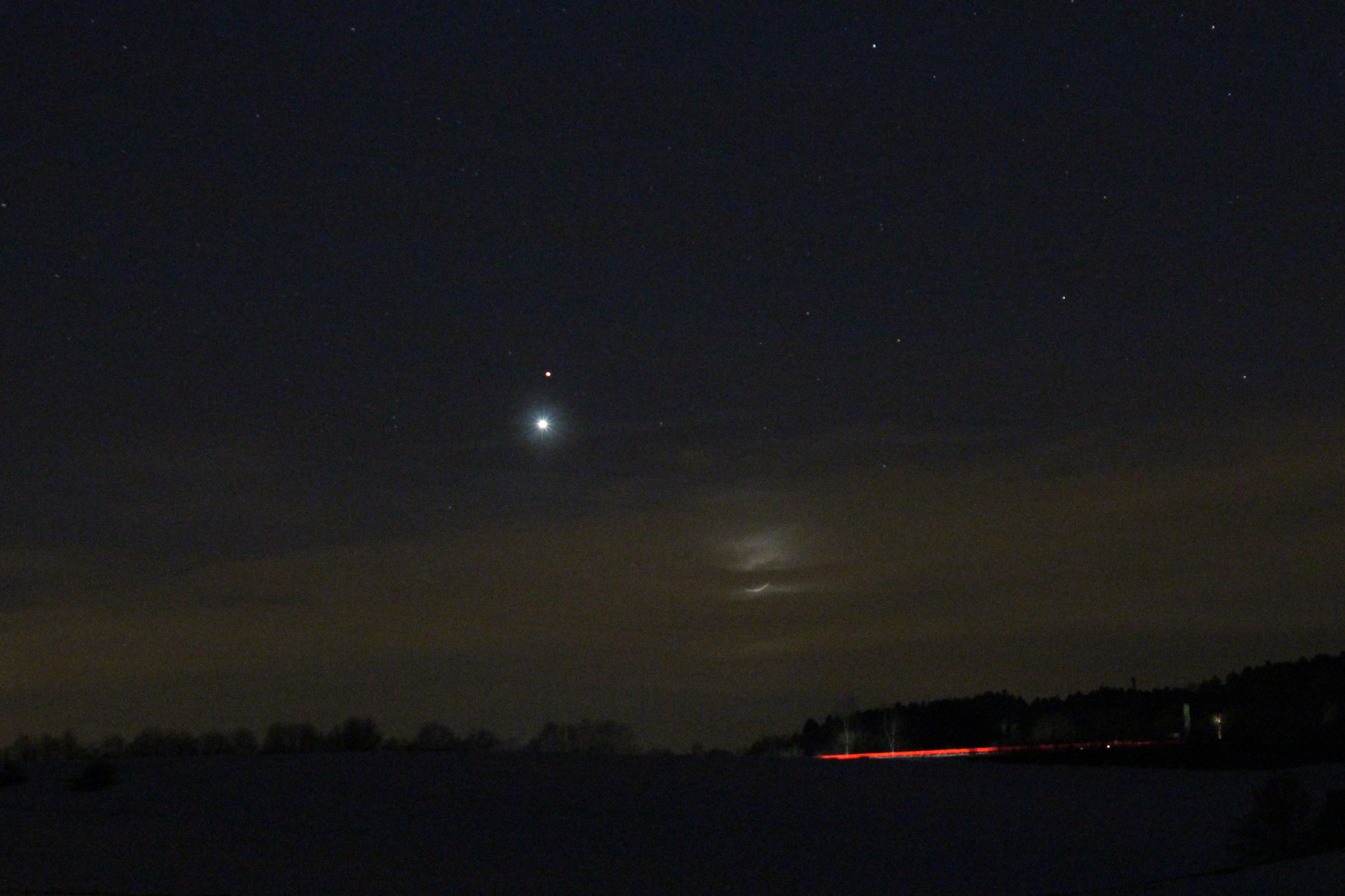 Venus und Mars über einem Feld südlich von Rottweil. Der Mond scheint durch horizontnahe Wolken durch.