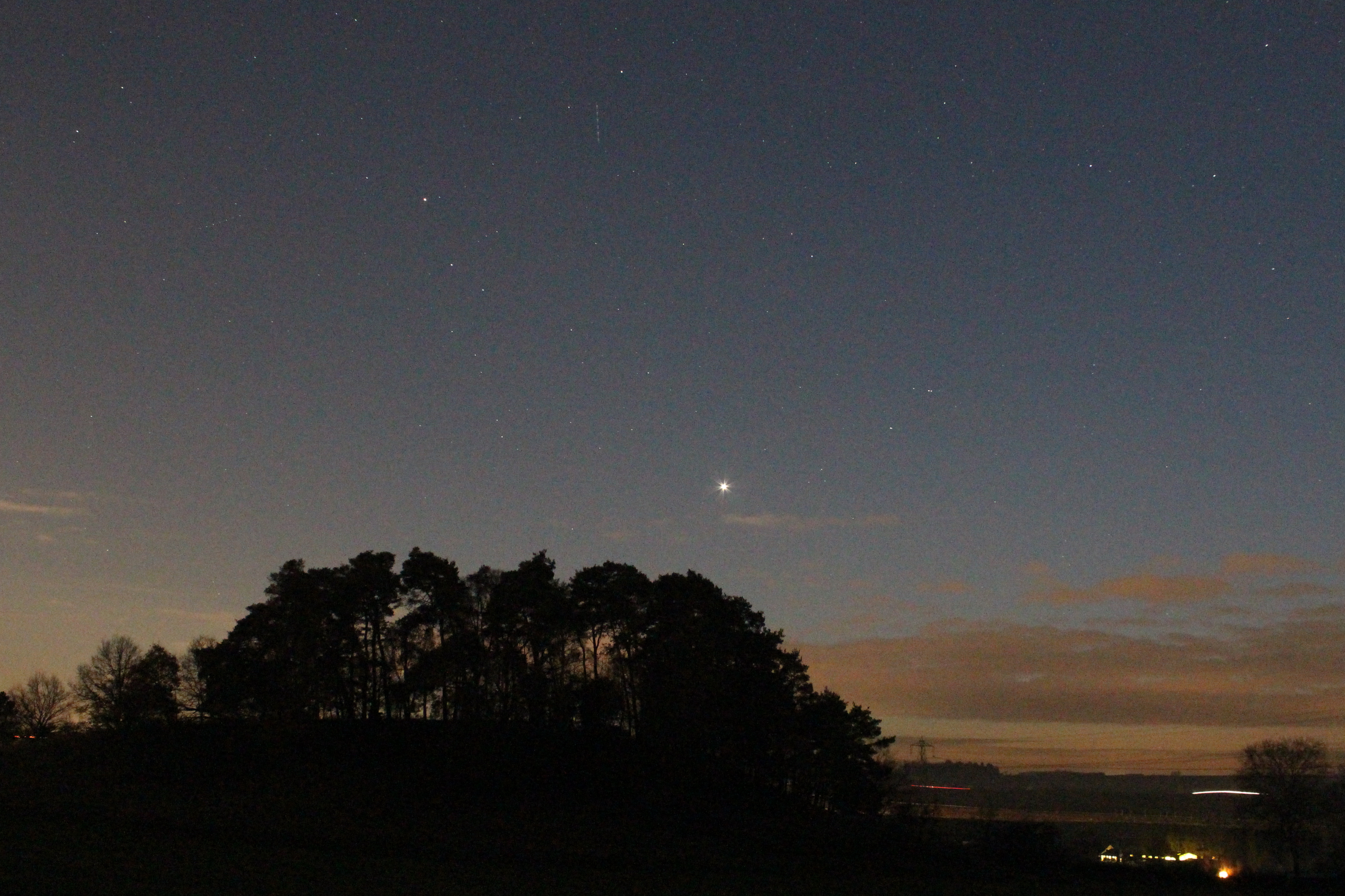 Venus und Mars am Abendhimmel im Sternbild Steinbock über einen Wäldchen nördlich von Magstadt.